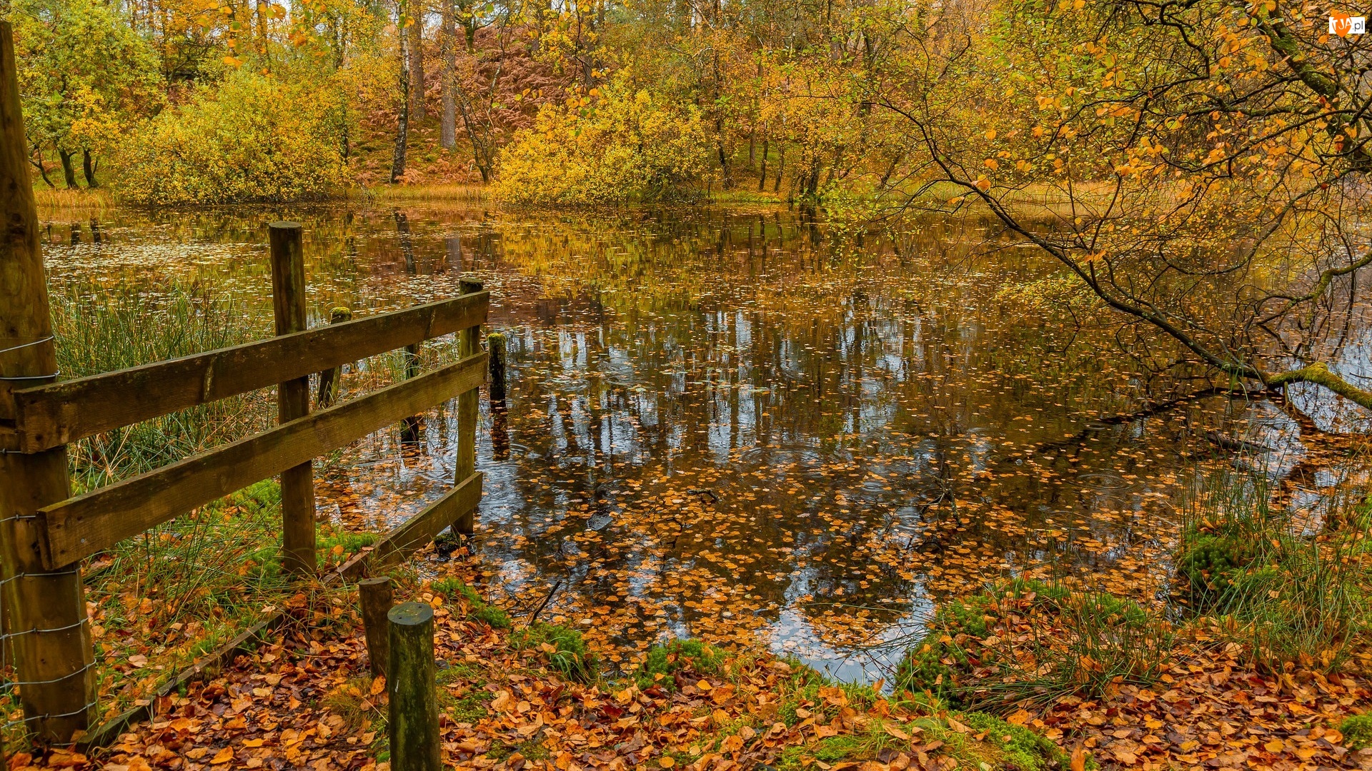 Drzewa, Ogrodzenie, Staw, Jesień, Liście