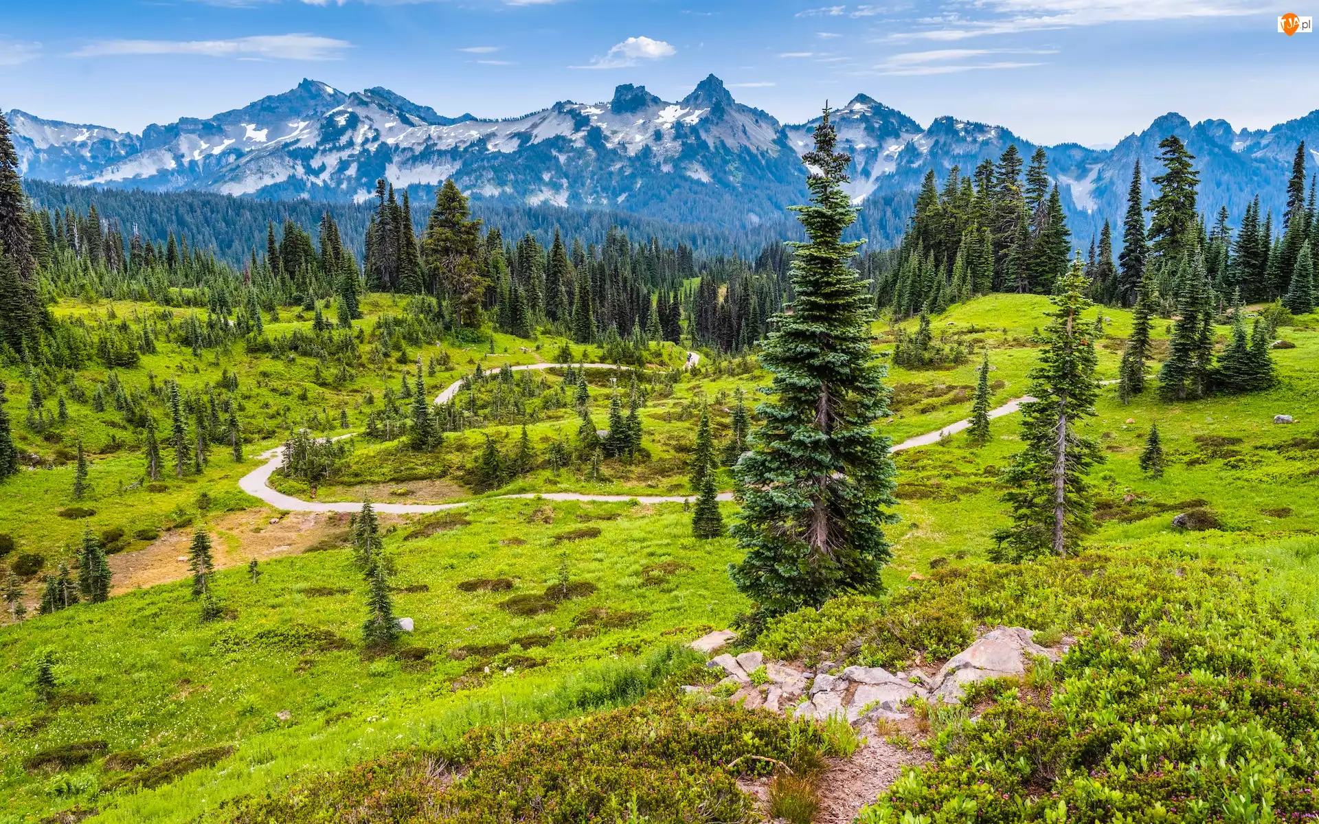 Drzewa, Park Narodowy Mount Rainier, Łąka, Stan Waszyngton, Góry, Droga, Stany Zjednoczone, Tatoosh Range