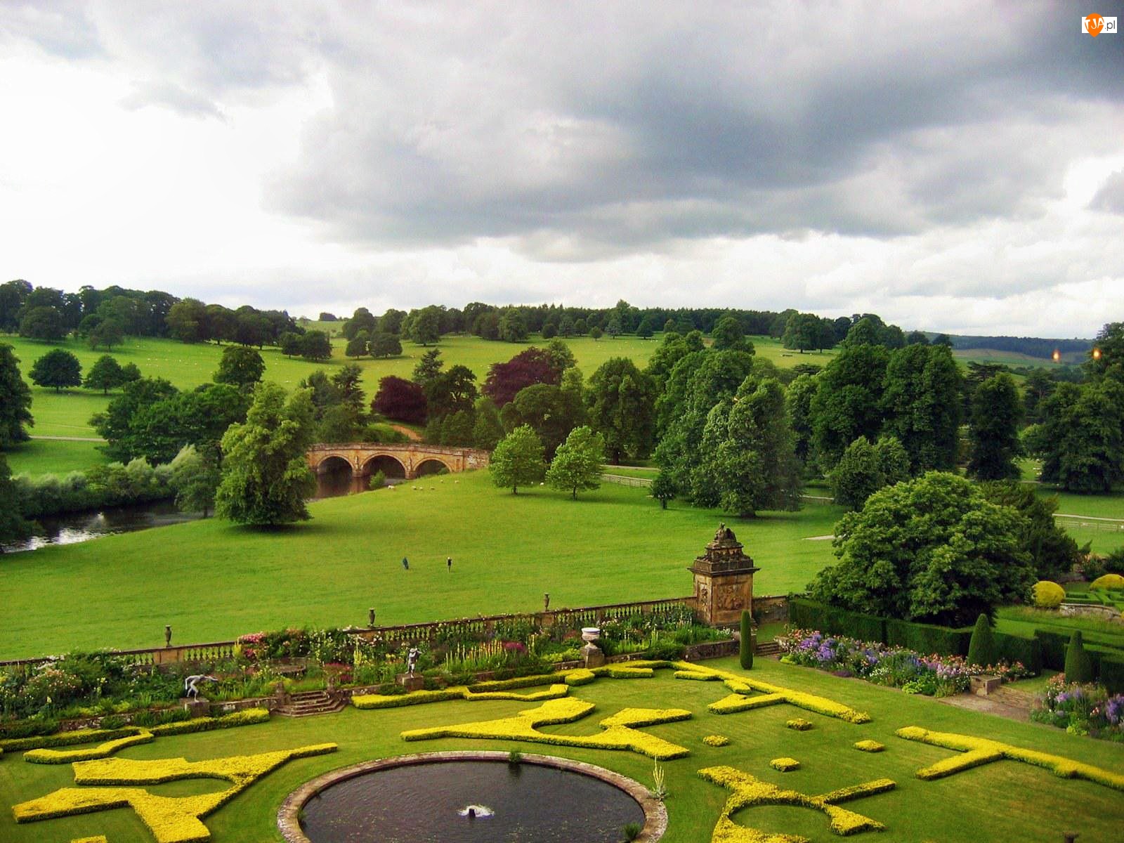 Drzewa, Pola, Rzeka, Ogrody, Most