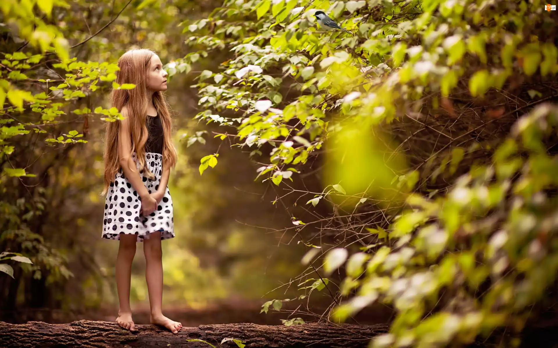 Drzewa, Przebijające, Dziewczynka, Światło, Las, Ptaszek