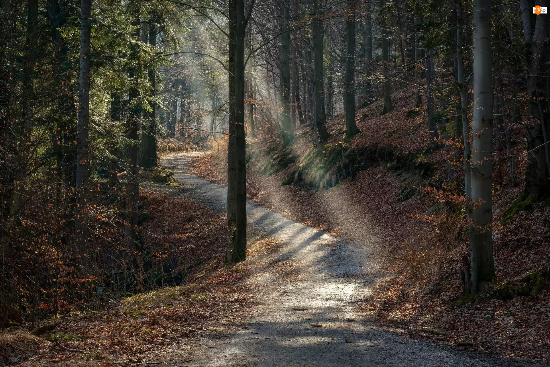 Przebijające światło, Ścieżka, Drzewa, Las, Jesień