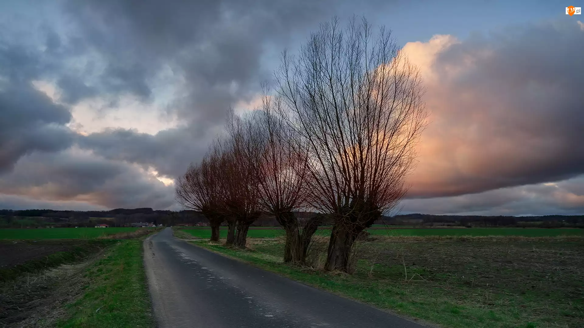 Droga, Pole, Wierzby, Chmury, Drzewa, Niebo