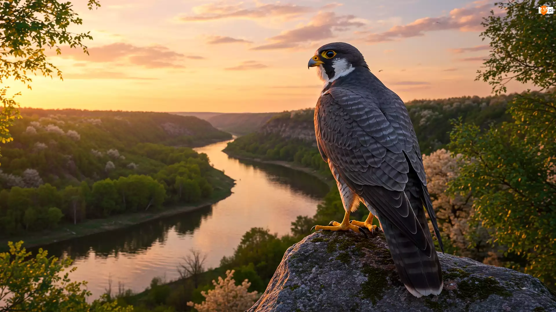 Drzewa, Ptak, Rzeka, Niebo, Sokół, Las, Zachód słońca, Kamień