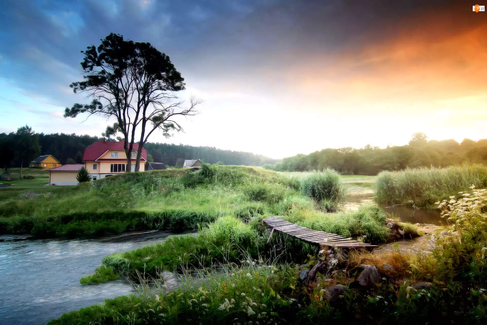 Drzewa, Rzeczka, Dom, Kładka, Trawy