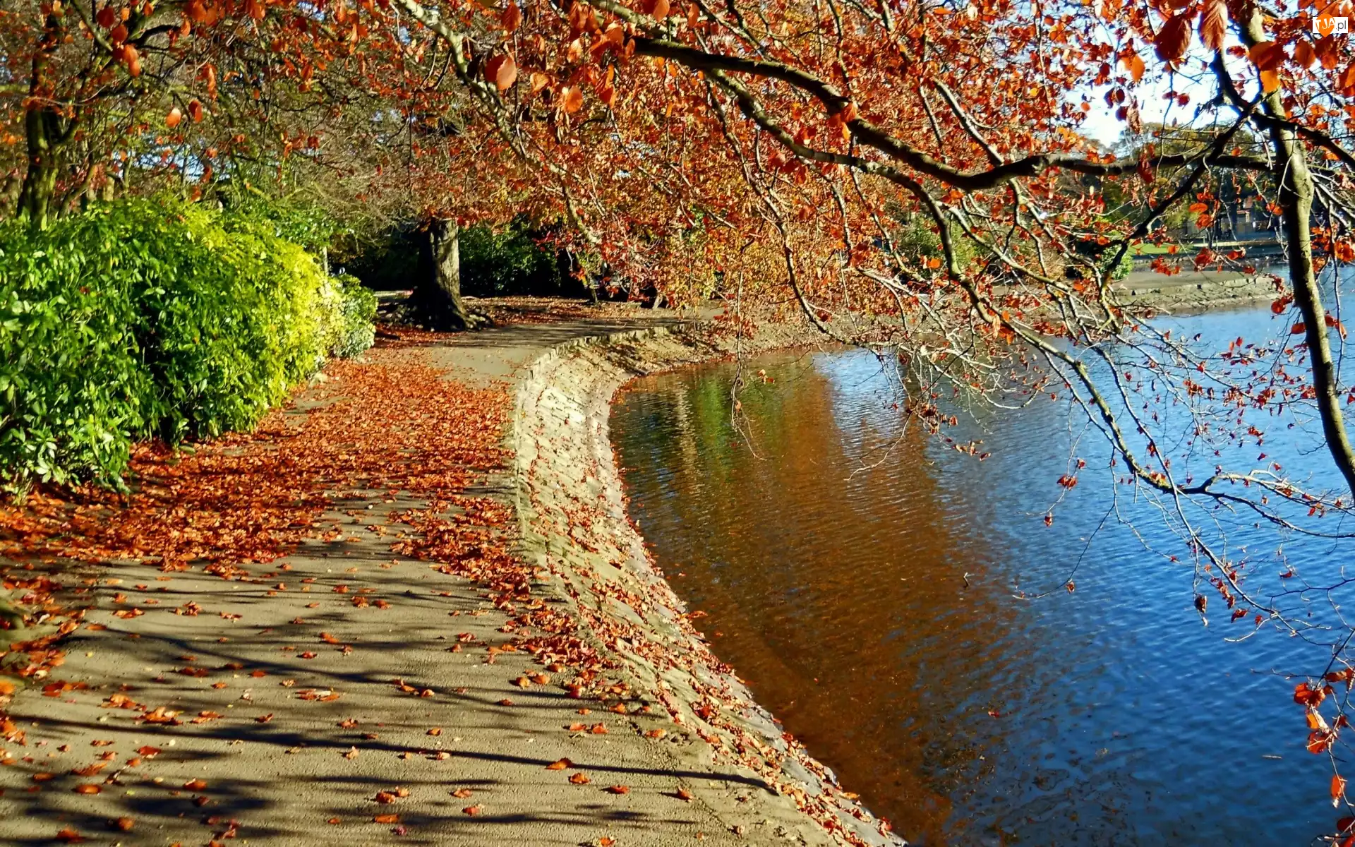 Drzewa, Rzeka, Jesień, Bulwar, Liście