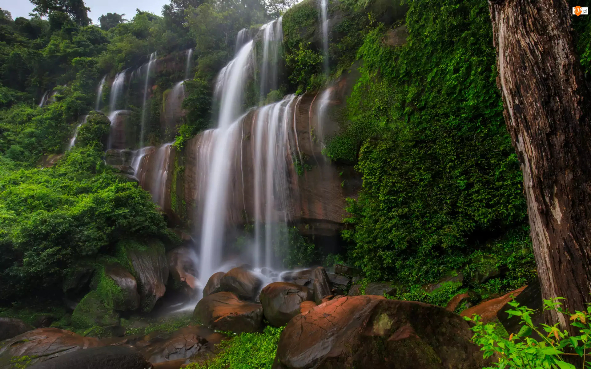 Drzewa, Rzeka, Roślinność, Las, Kamienie, Wodospad, Skały