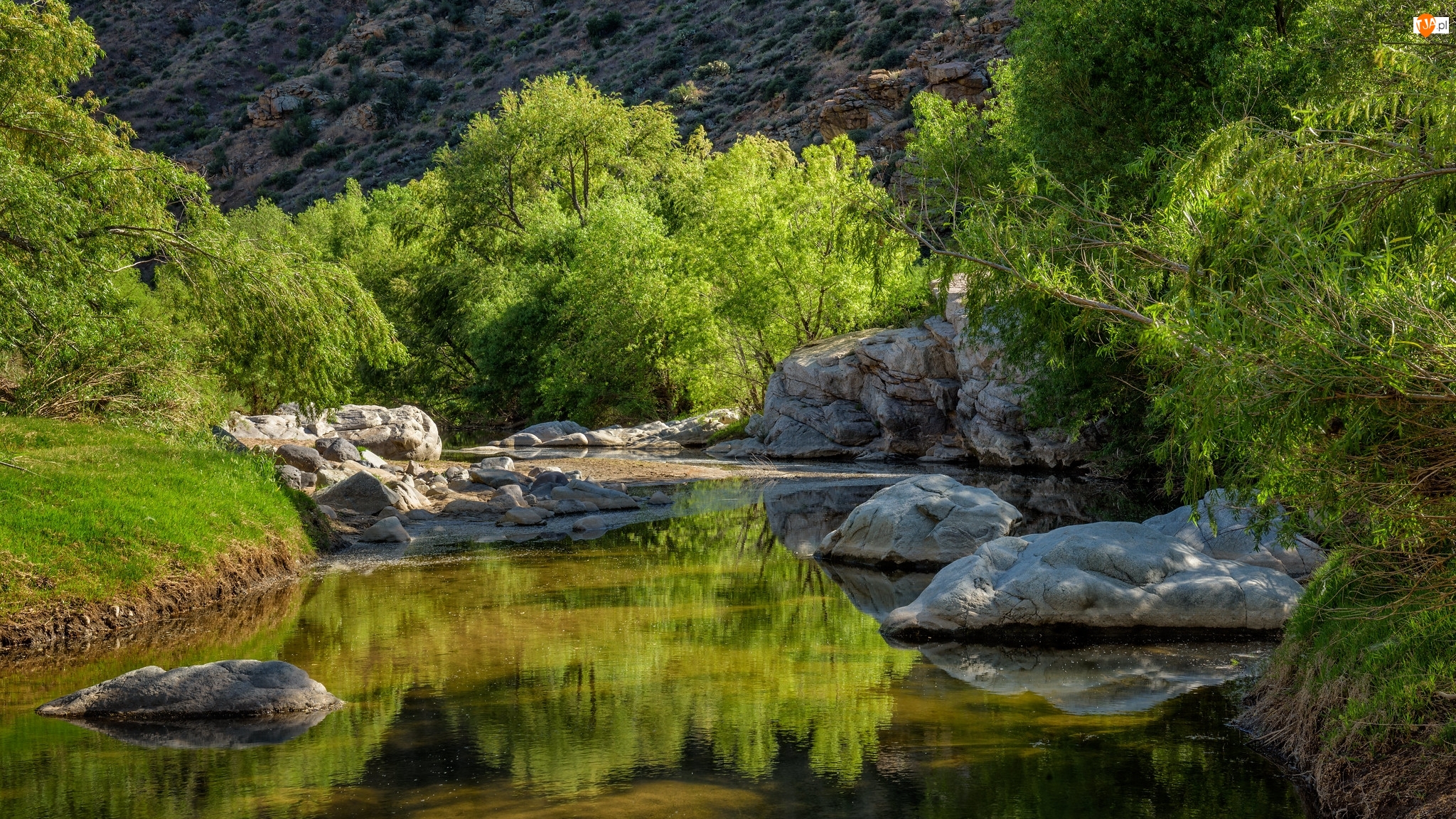 Drzewa, Skały, Odbicie, Rzeka, Drzewa, Roślinność, Kamienie