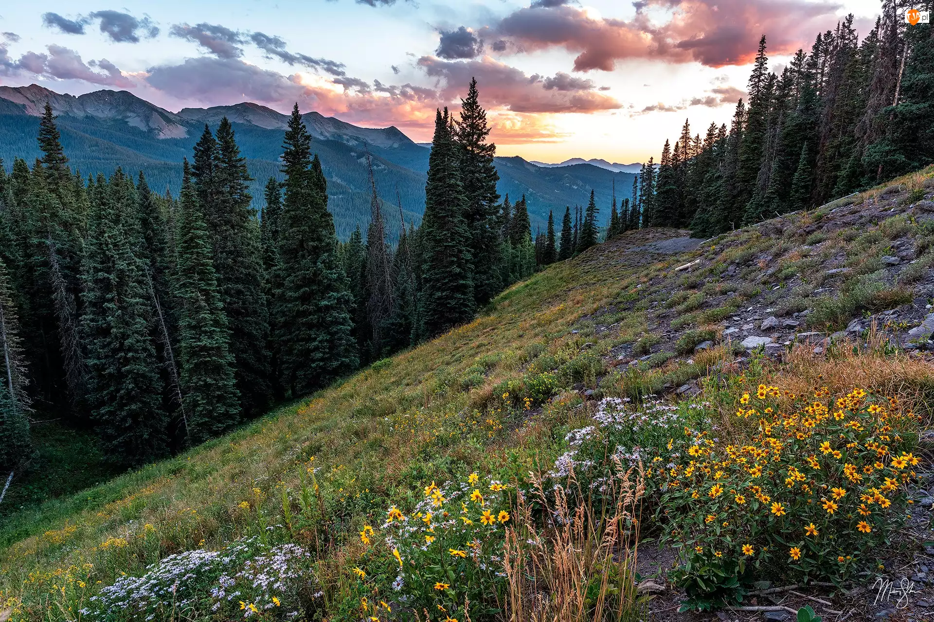 Drzewa, Stany Zjednoczone, Las, Polana, Kolorado, Gunnison National Forest, Kwiaty, Góry
