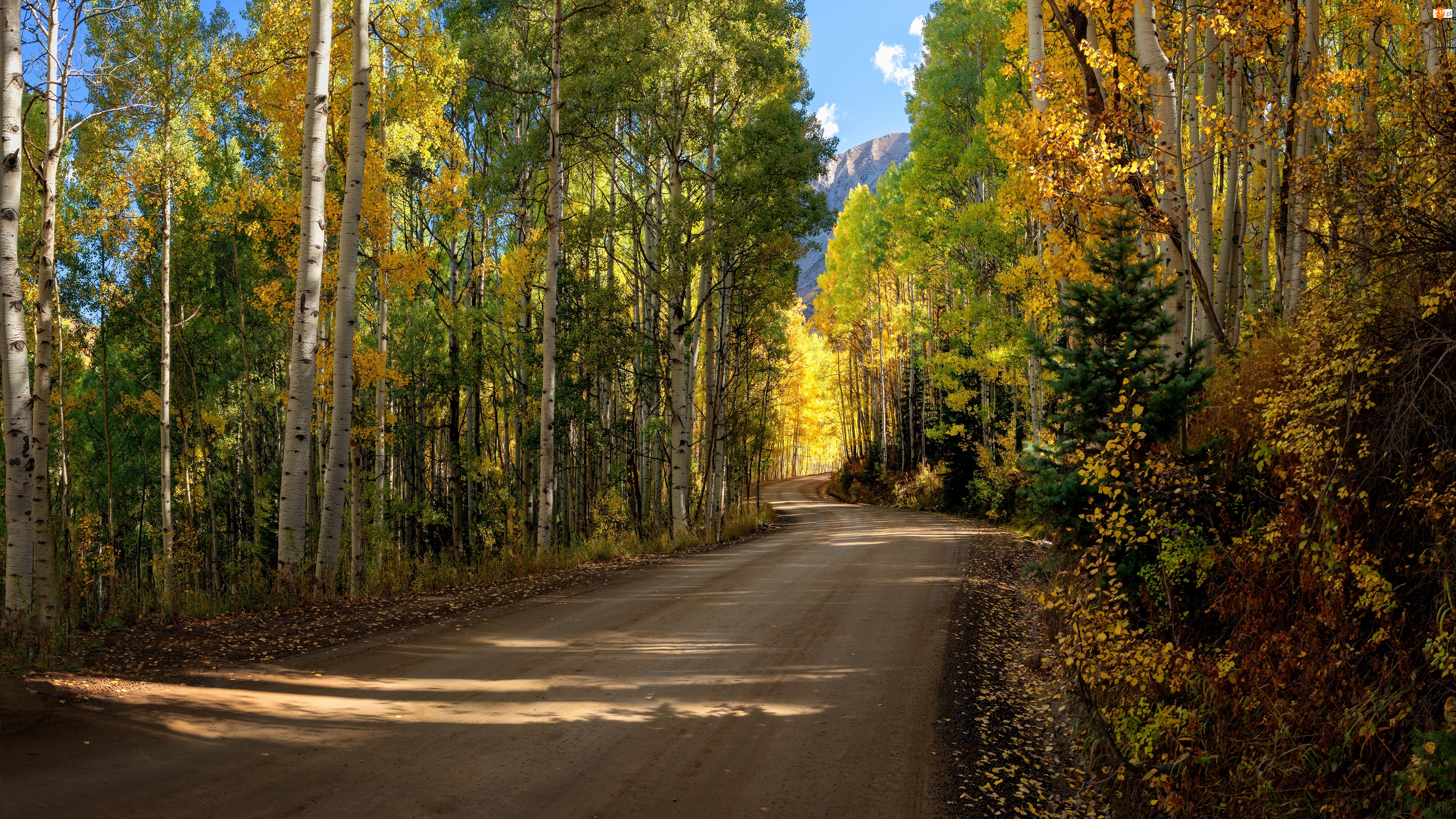 Drzewa, Topole osikowe, Jesień, Las, Niebo, Góry, Droga