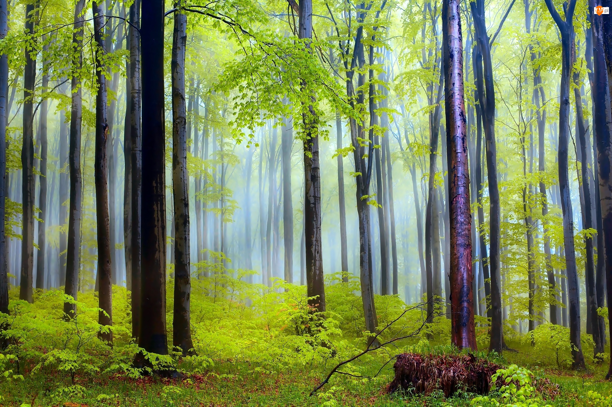 Drzewa, Wiosna, Mgła, Poranek