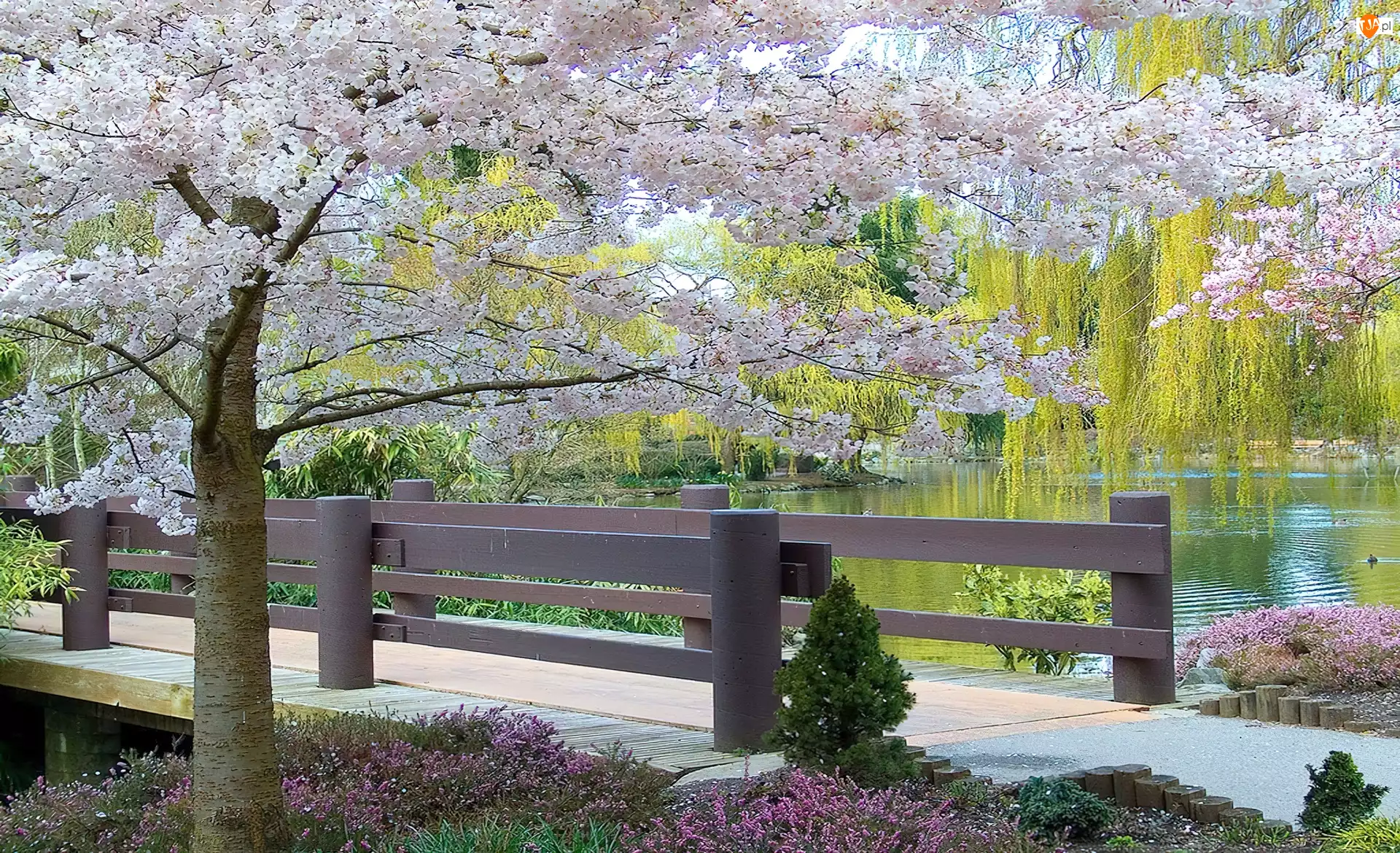 Drzewa, Wiosna, Staw, Mostek, Kwitnące