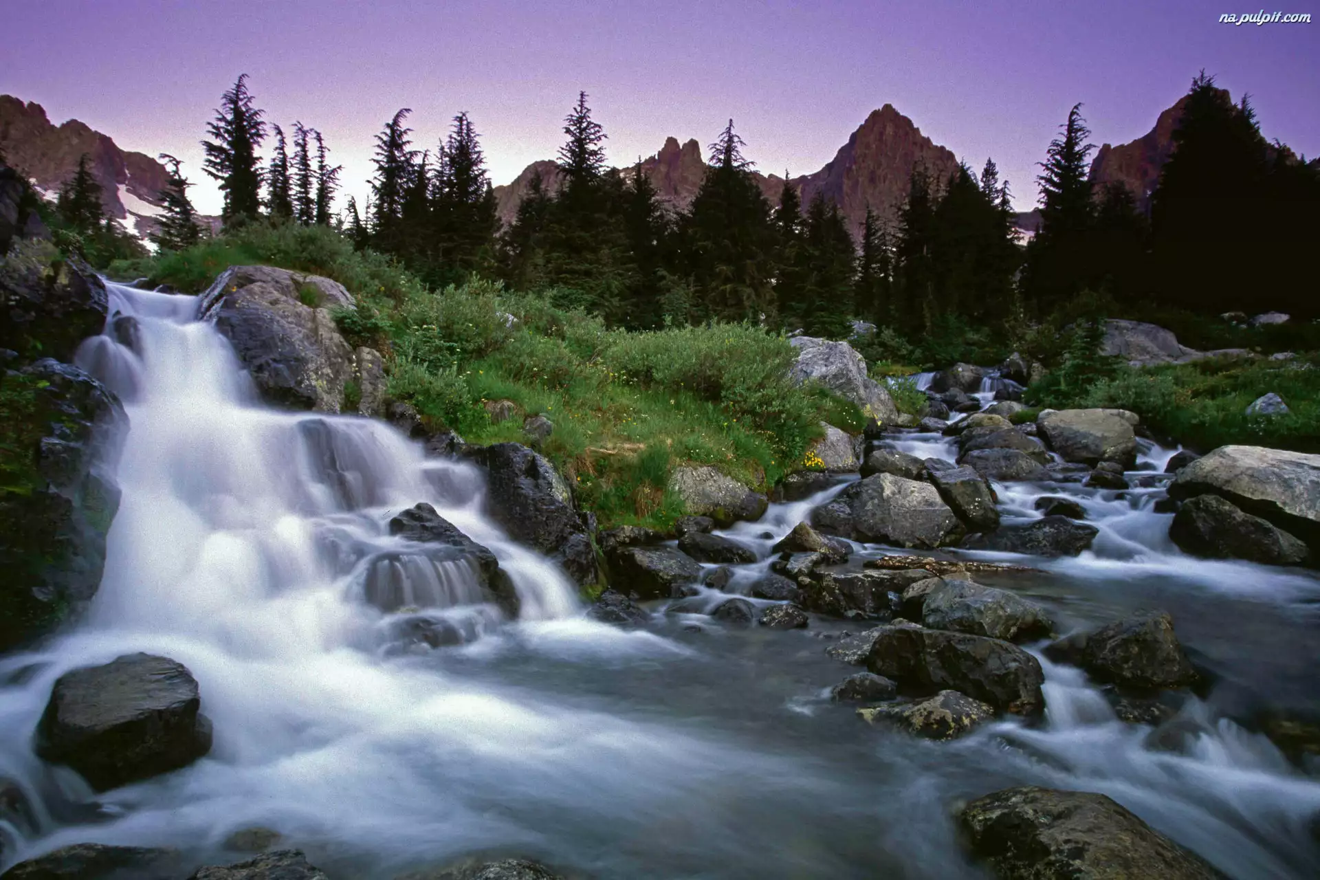 Drzewa, Wodospad, Kamienie, Rzeka, Góry
