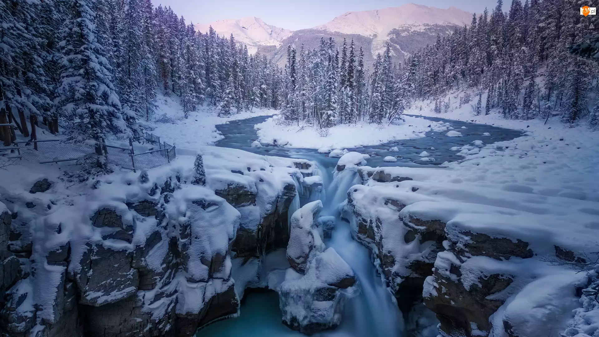 Drzewa, Wodospad Sunwapta Falls, Zima, Prowincja Alberta, Rzeka Sunwapta, Góry, Kanada, Park Narodowy Jasper