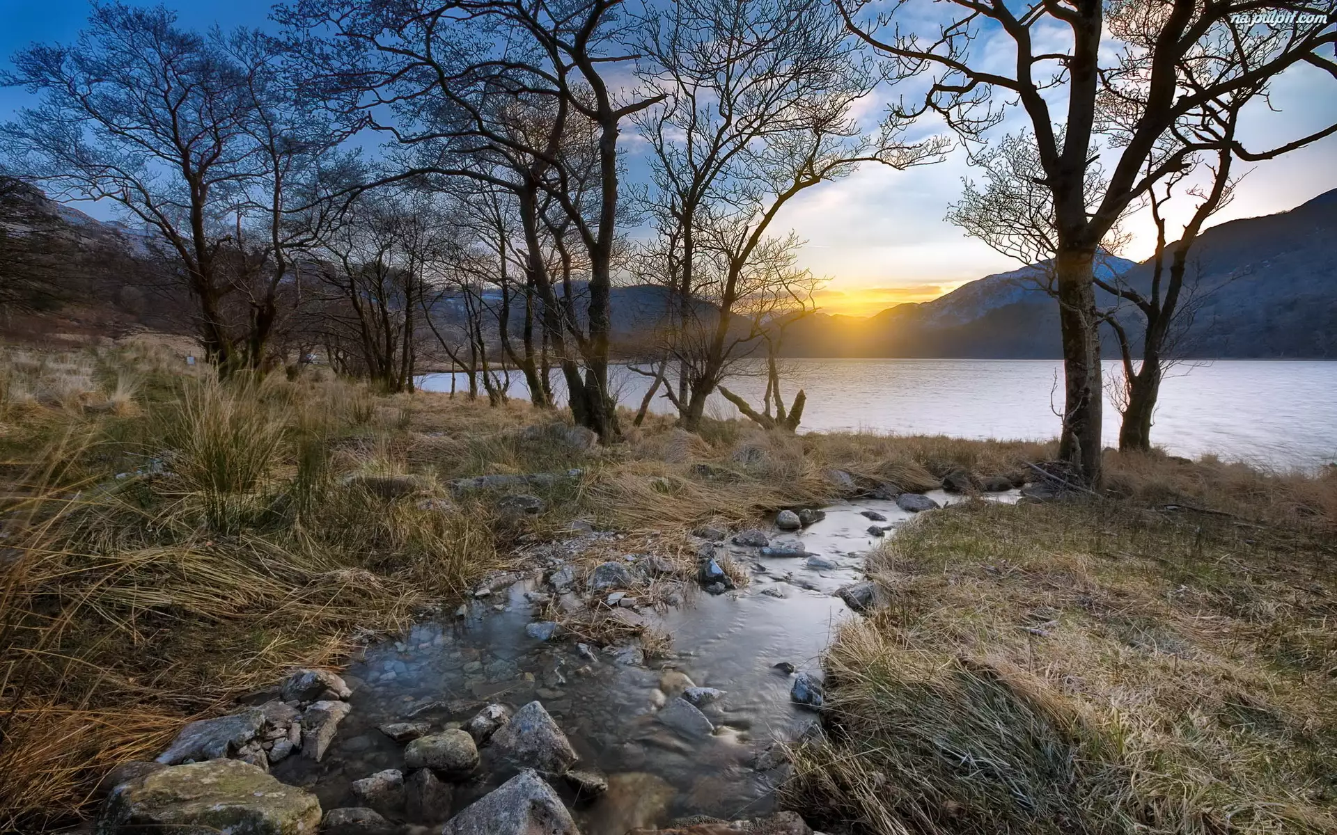 Drzewa, Wschód, Jezioro, Słońca, Strumyk