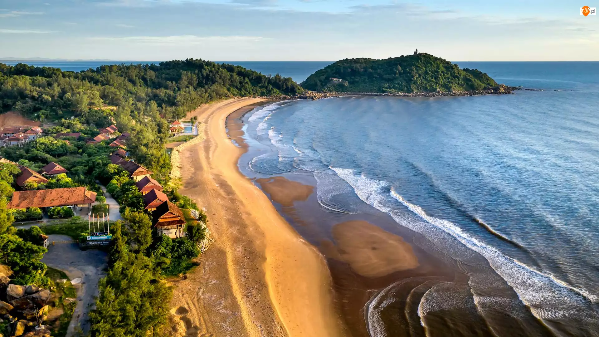Drzewa, Z lotu ptaka, Domy, Plaża, Morze