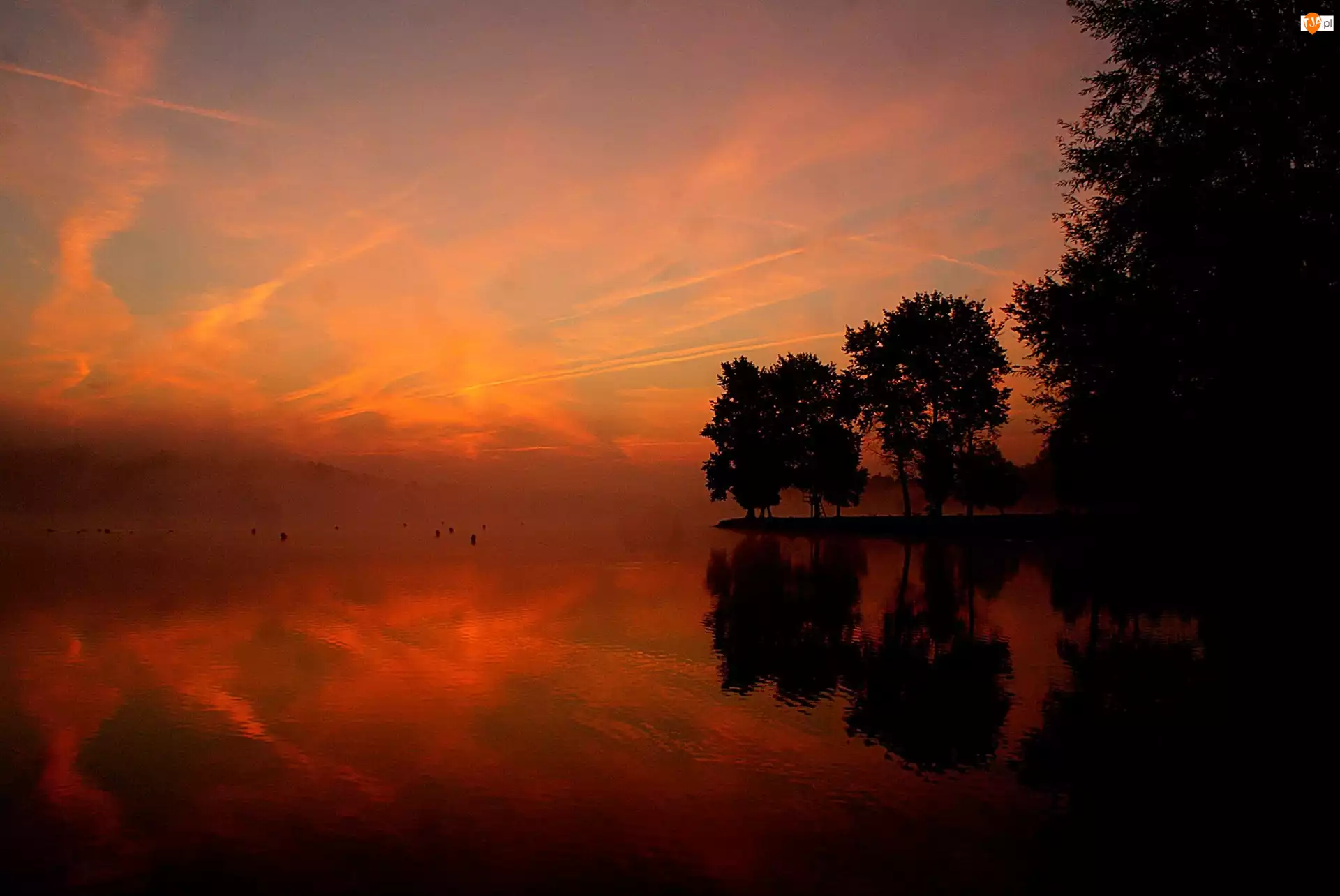Drzewa, Zachód, Jezioro, Słońca, Odbicie
