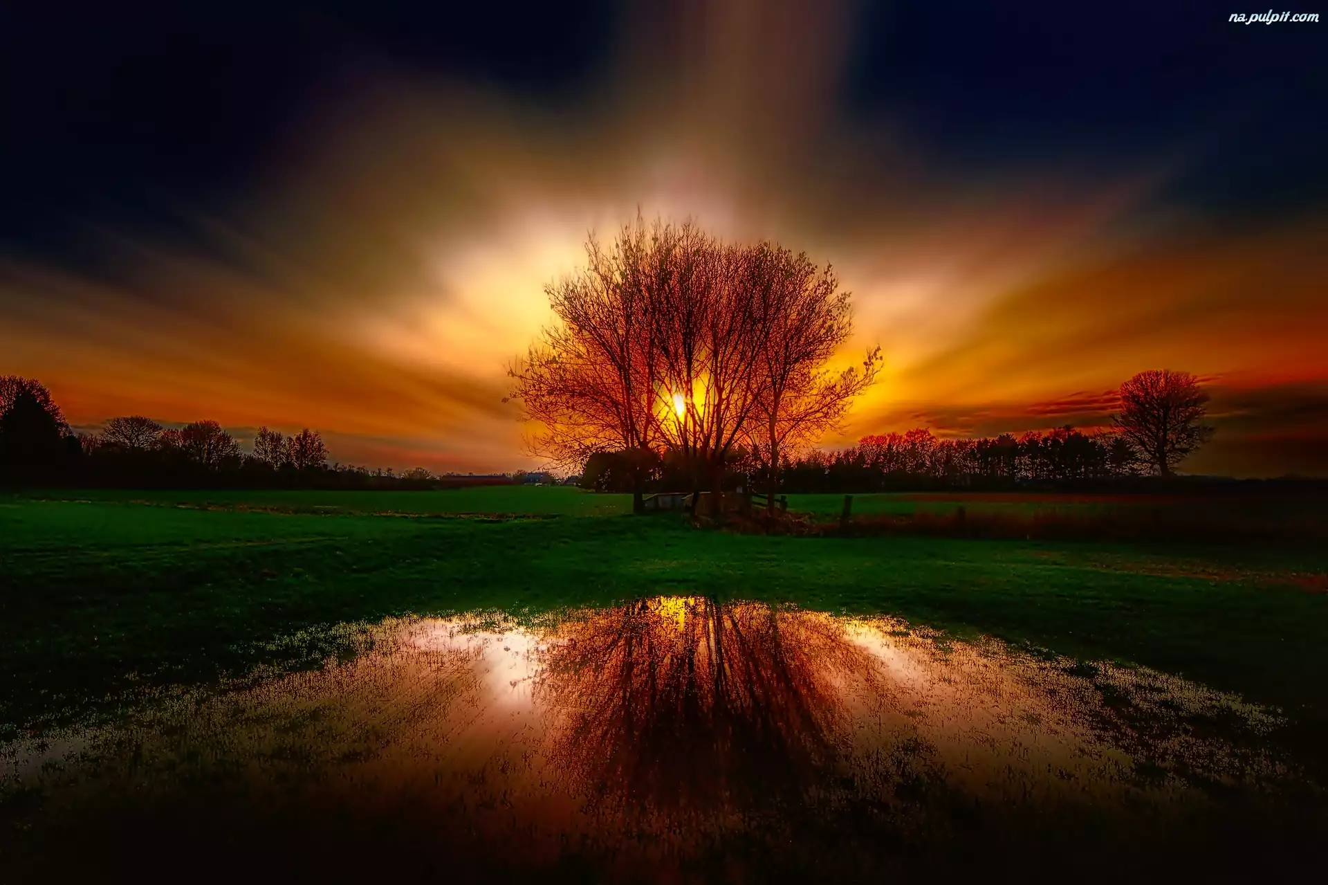 Drzewa, Zachód słońca , Łąka