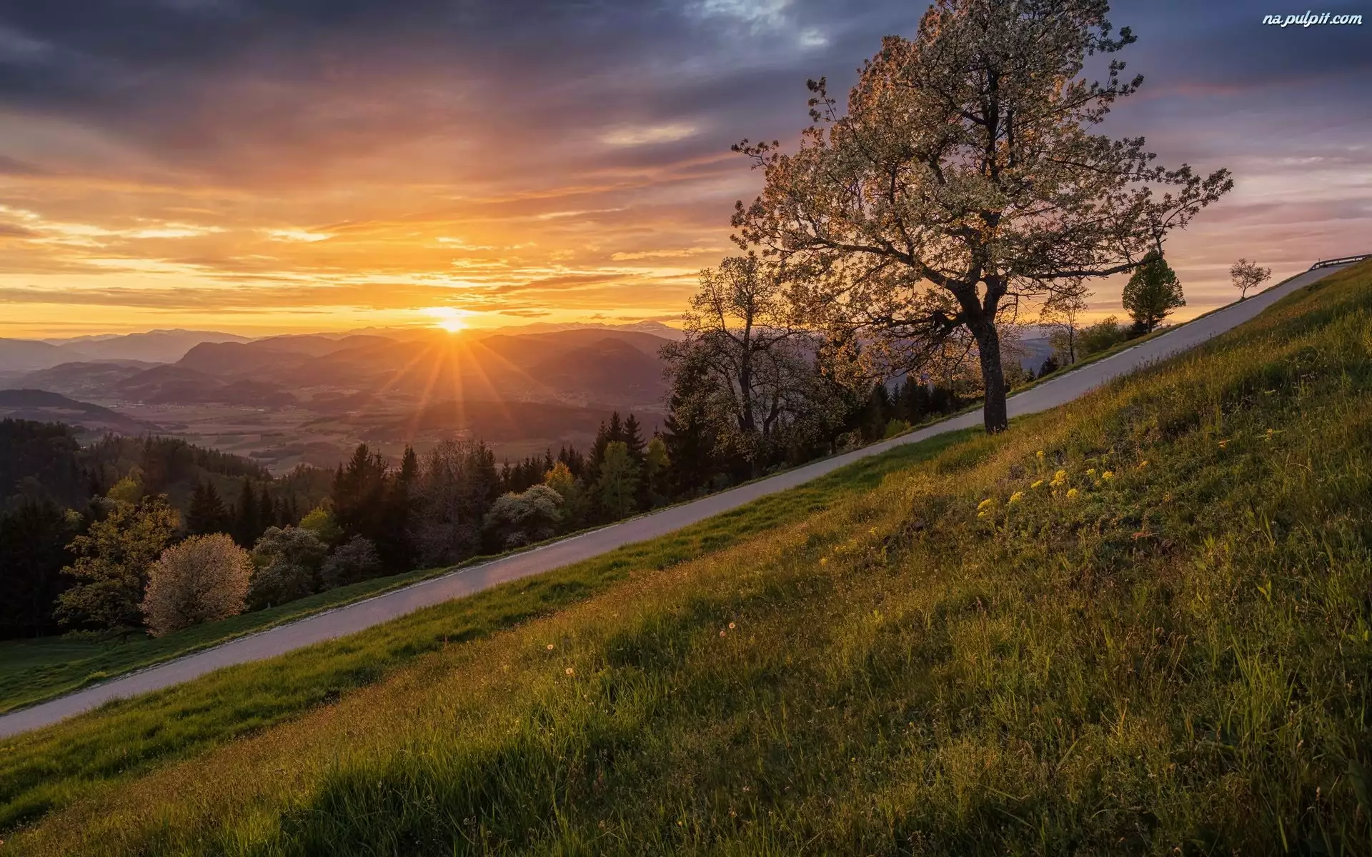 Drzewa, Zachód słońca, Las, Góry, Droga