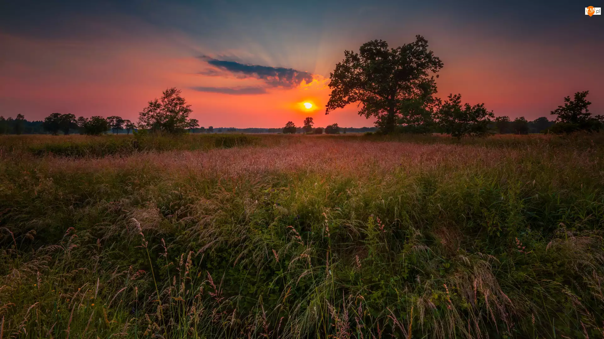 Drzewa, Zachód słońca, Trawa, Łąka, Chmury