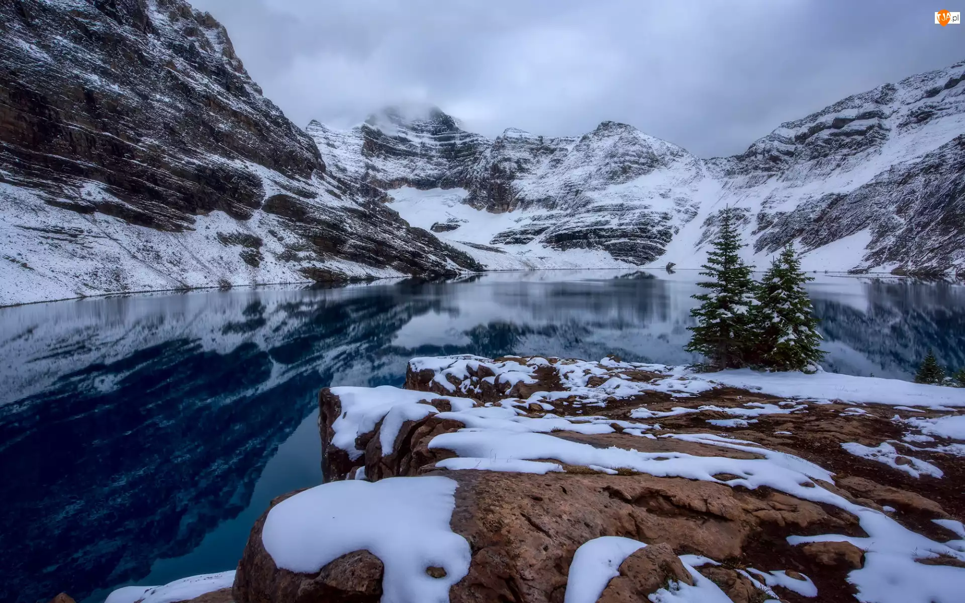 Drzewa, Zima, Chmury, Kamienie, Kolumbia Brytyjska, Lake McArthur, Śnieg, Góry, Park Narodowy Yoho, Odbicie, Kanada, Jezioro, Canadian Rockies