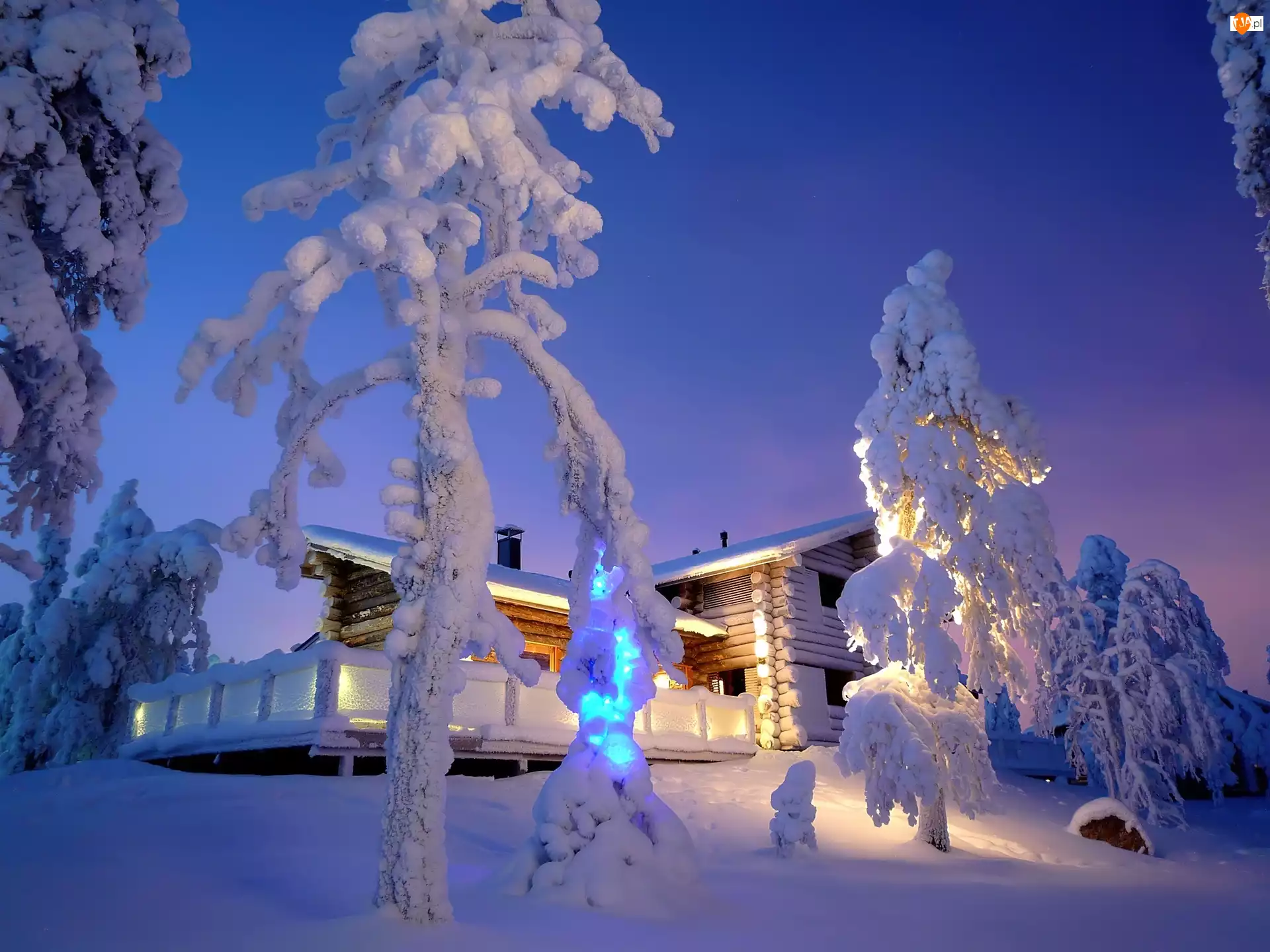 Drzewa, Zima, Domek, Oświetlony, Ośnieżone