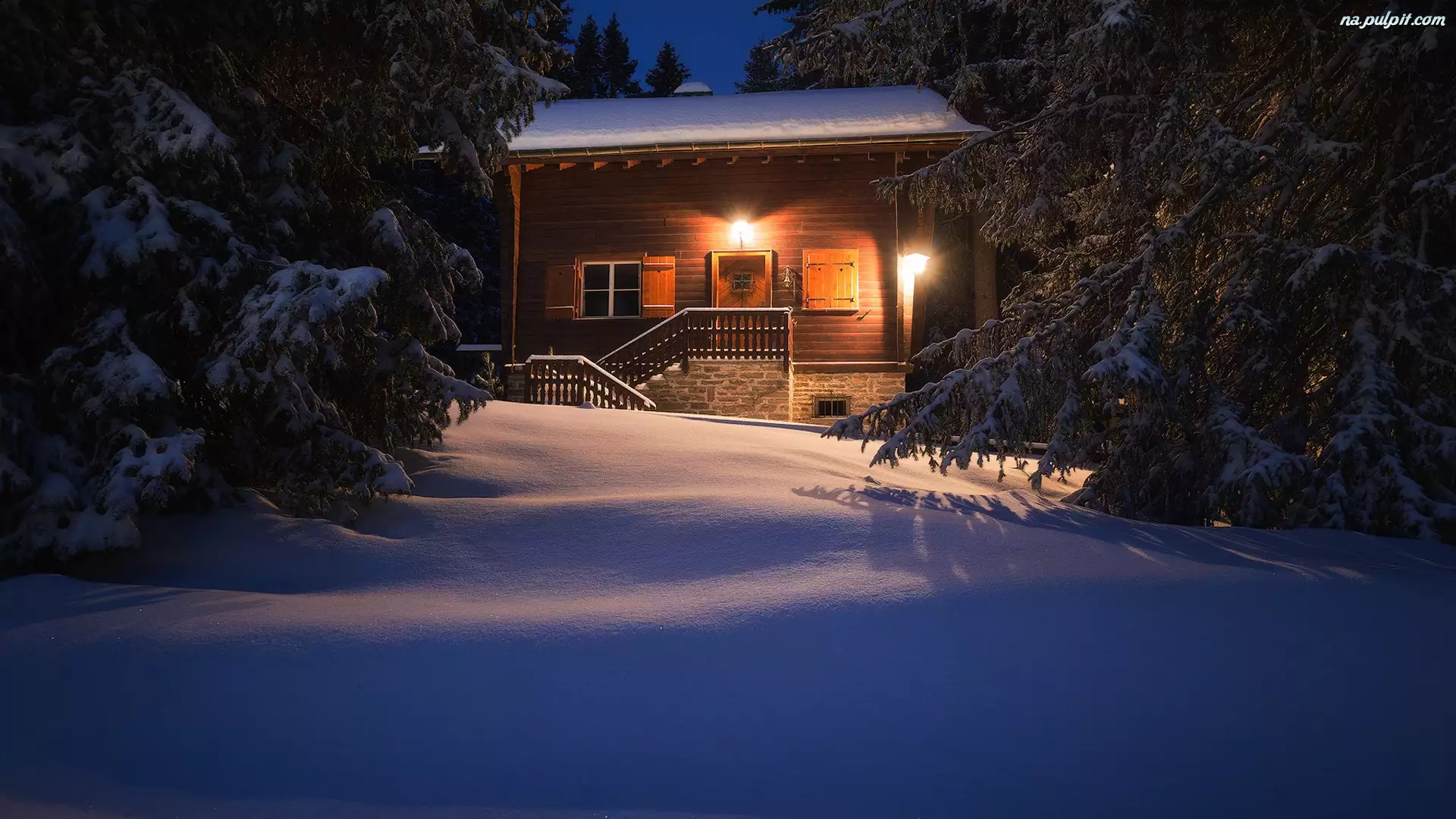 Drzewa, Zima, Śnieg, Dom, Las, Oświetlony