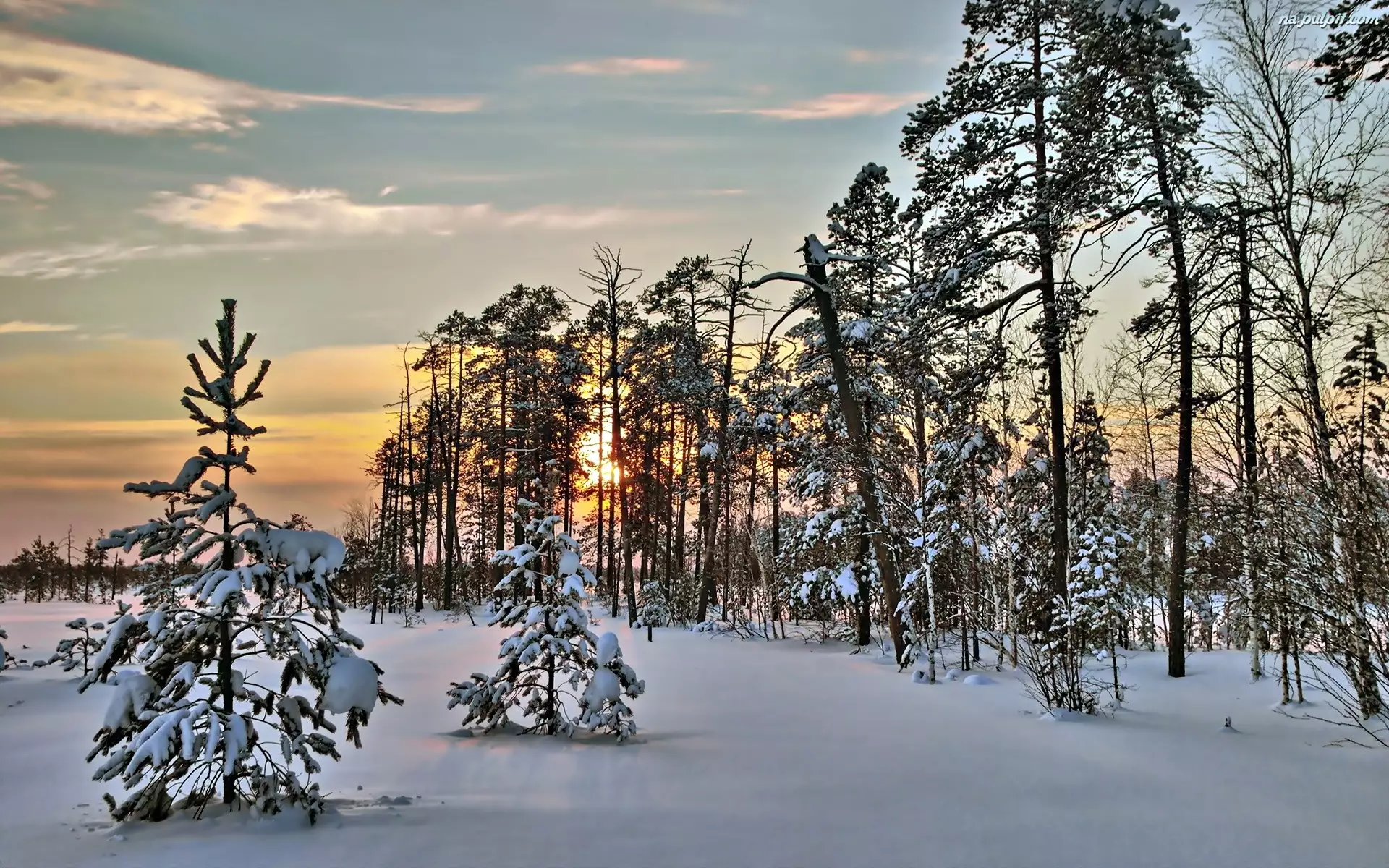 Drzewa, Zima, Zachód Słońca, Śnieg, Las