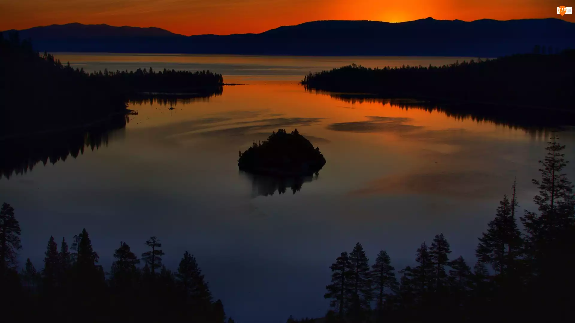 Drzewa, Zmierzch, Wzgórza, Jezioro