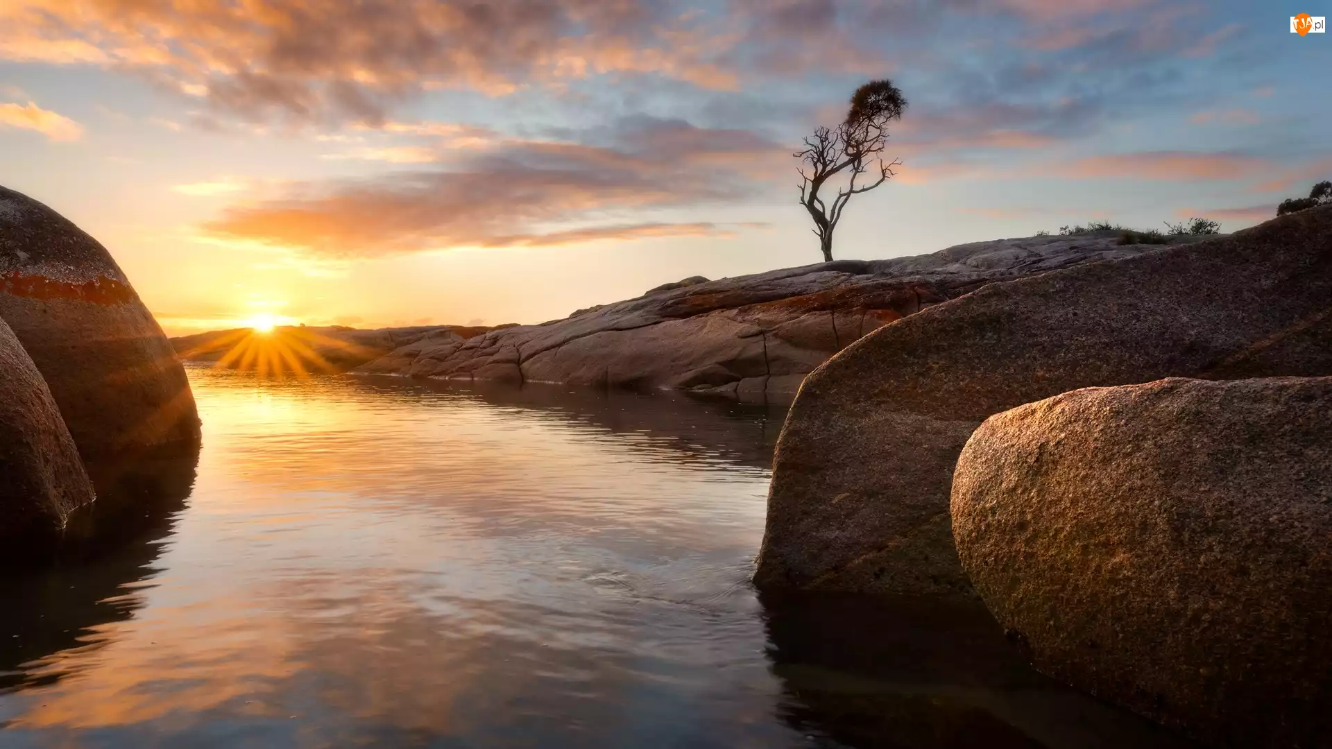 Drzewo, Australia, Morze, Wschód słońca, Tasmania, Skały, Chmury, Binalong Bay