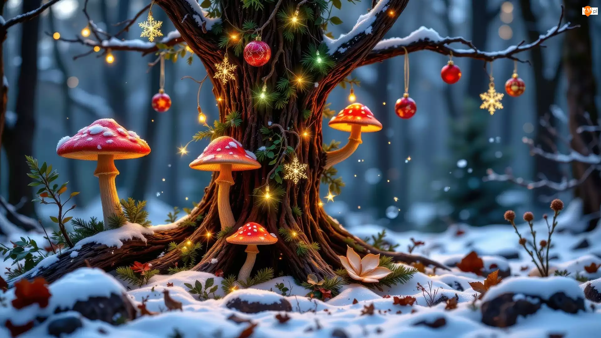 Drzewo, Bombki, Boże Narodzenie, Grafika, Muchomory, Grzyby, Śnieg