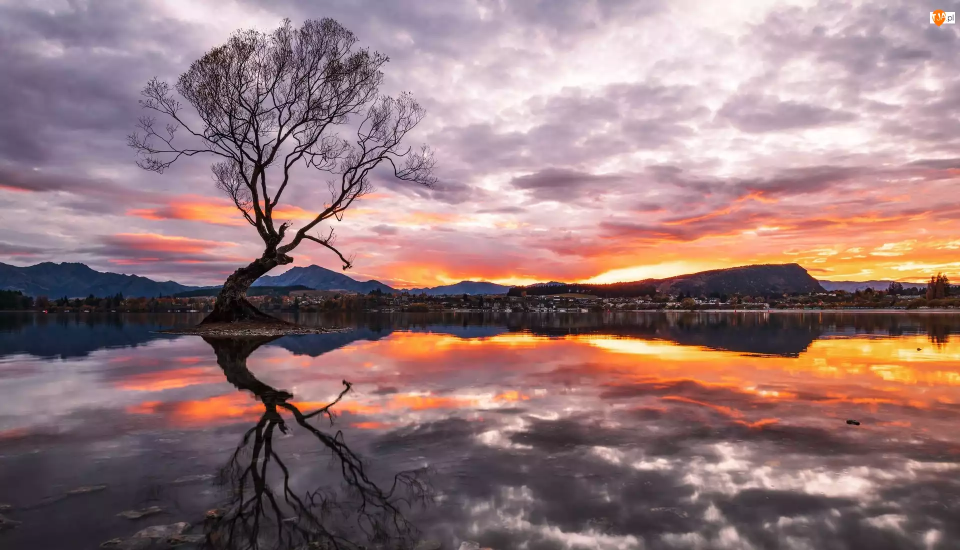 Drzewo, Chmury, Jezioro, Góry, Zachód słońca