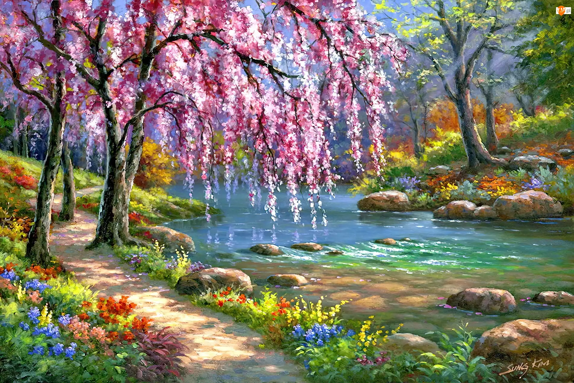 Kwiaty, Drzewo, Rzeka, Dróżka, Kwitnące
