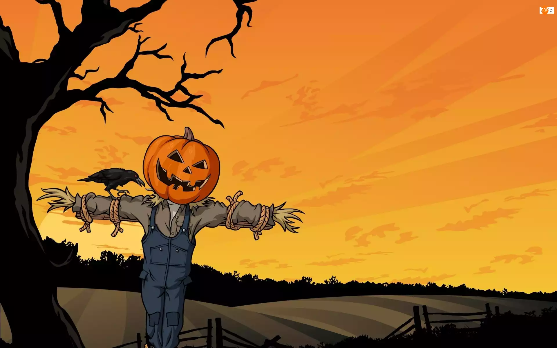 Drzewo, Halloween, Strach na wróble, Dynia, Wrona
