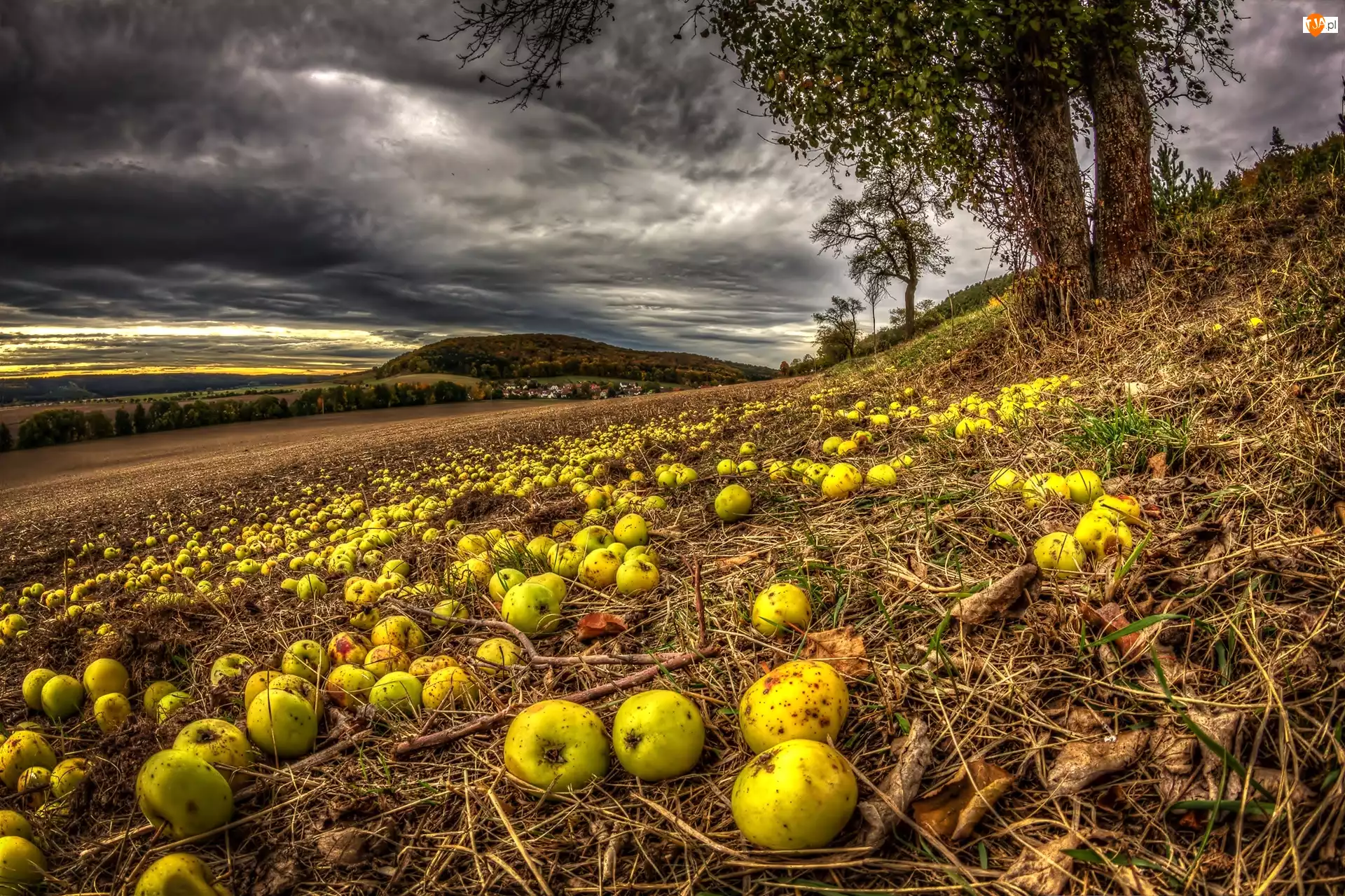 Drzewo, Jesień, Pole, Chmury, Jabłka