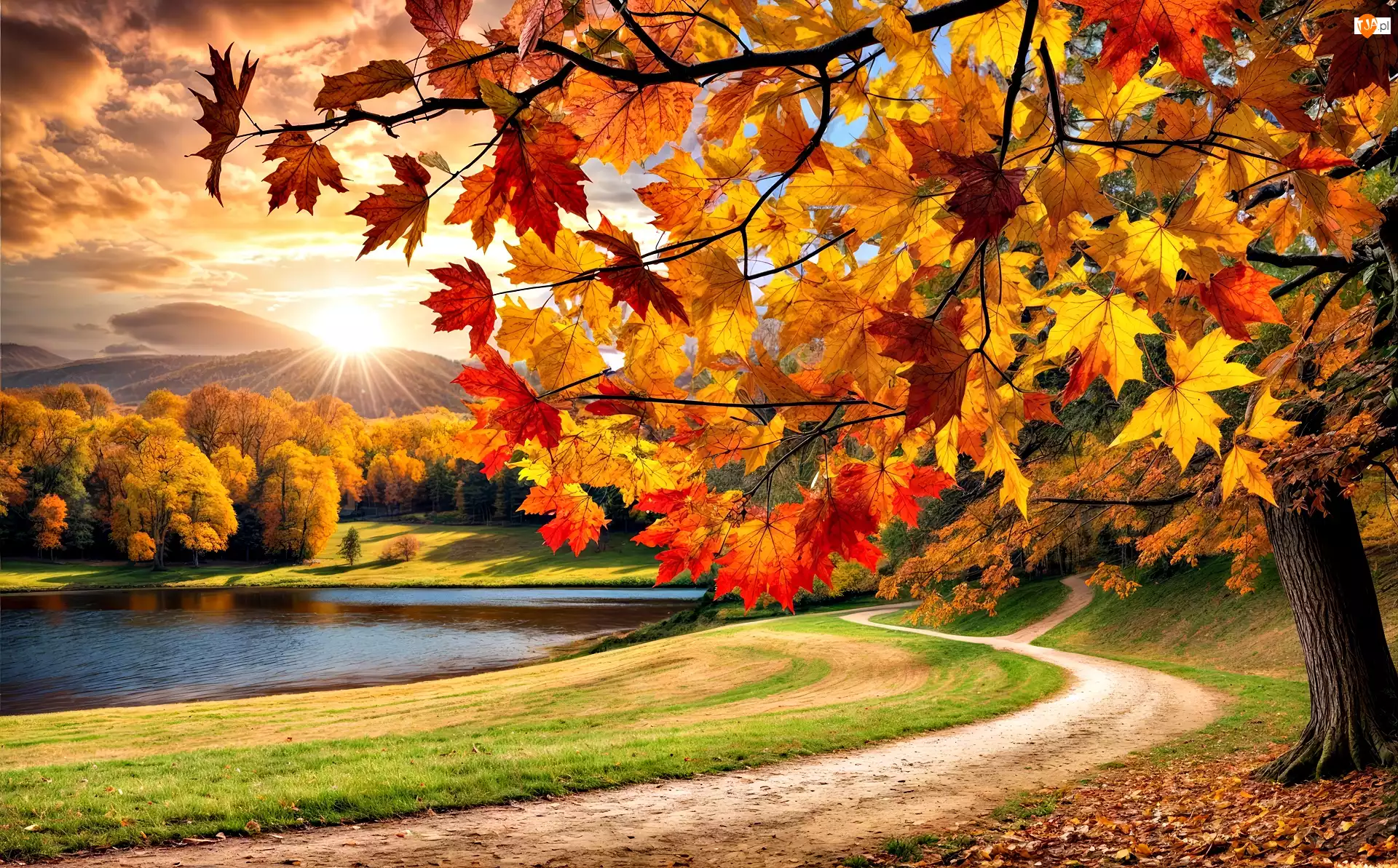 Drzewo, Klon, Grafika, Jesień, Zachód słońca, Staw, Droga