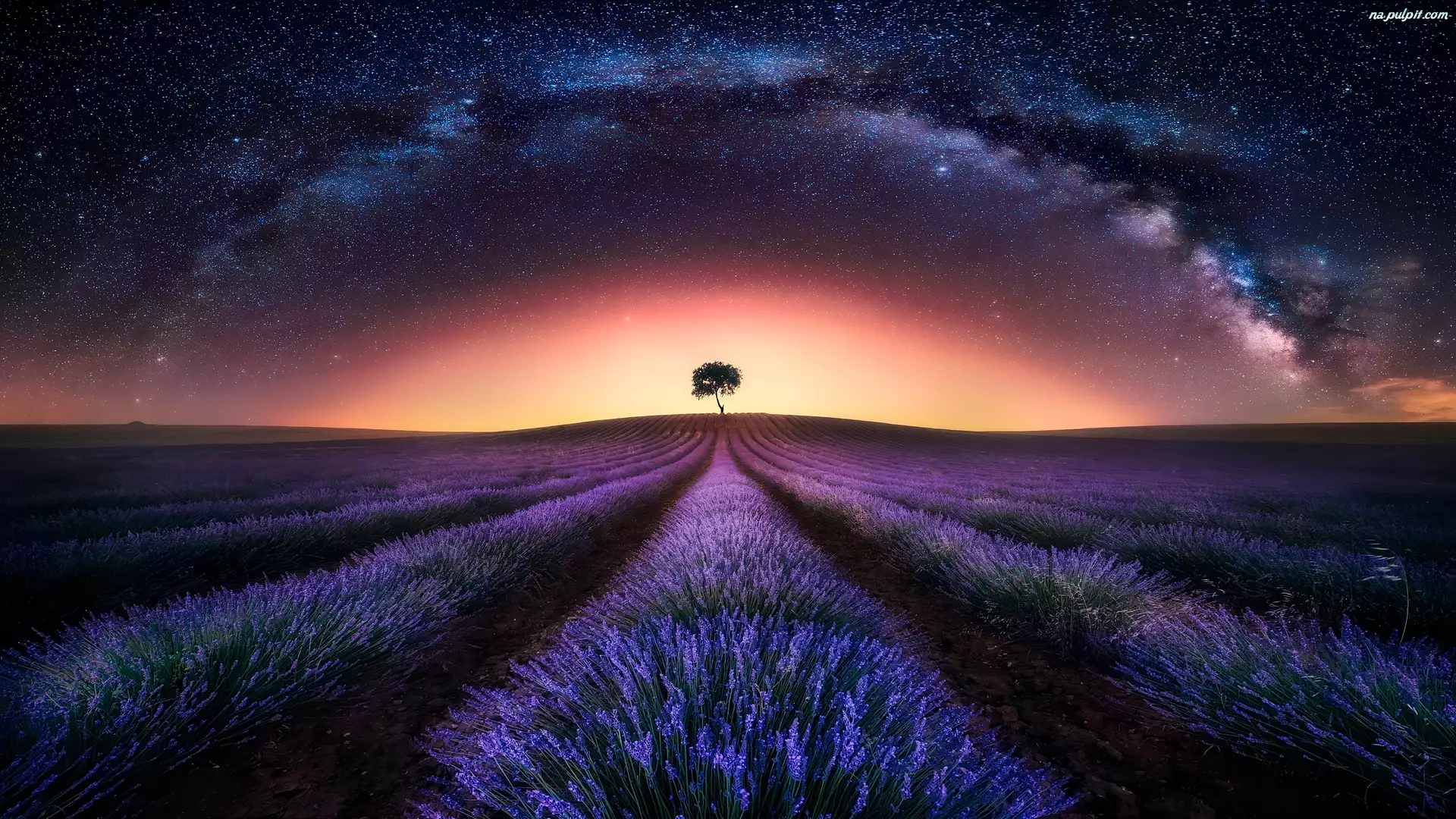 Gwiazdy, Noc, Drzewo, Niebo, Lawenda, Pole, Droga Mleczna