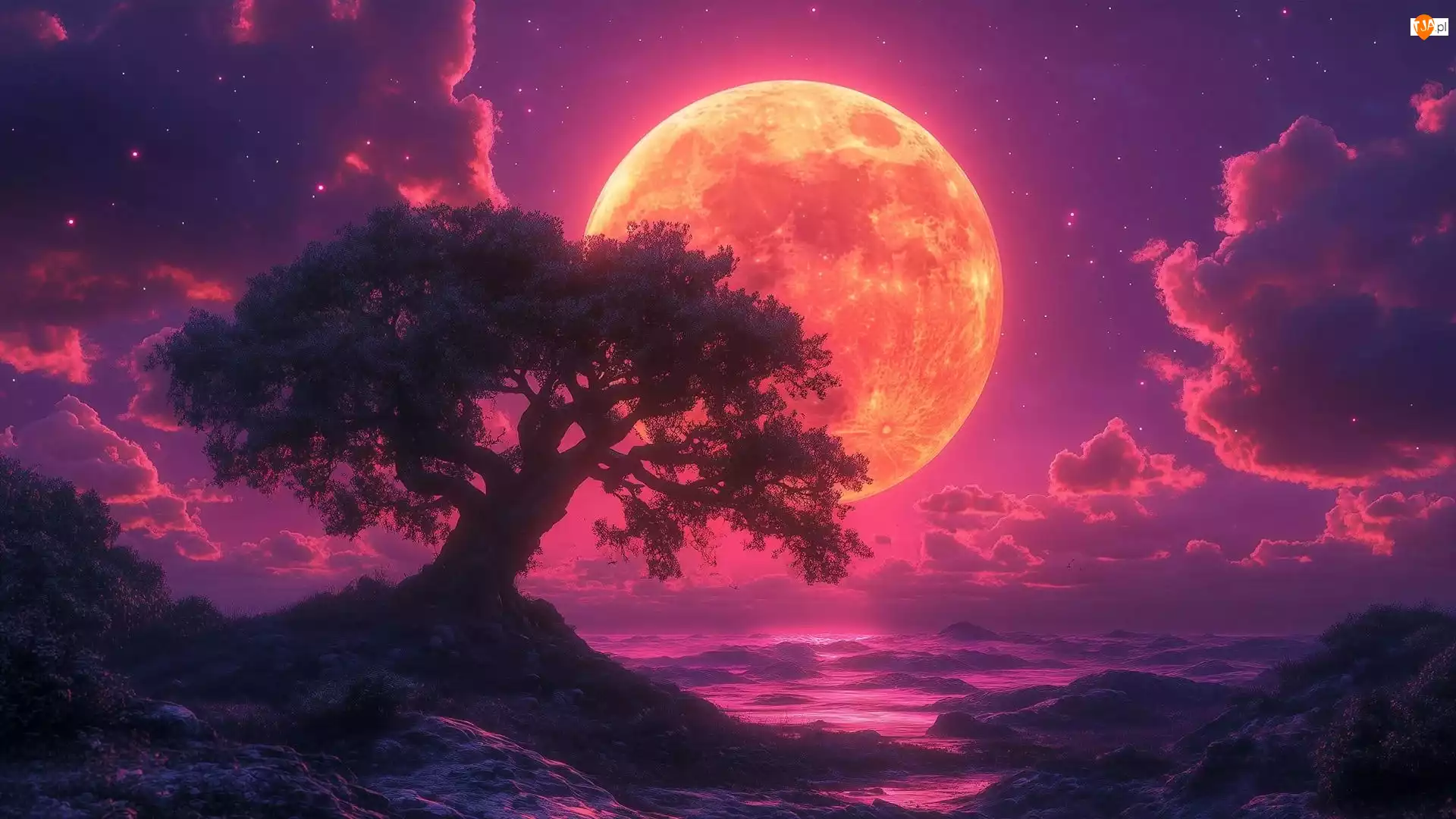 Księżyc, Grafika, Chmury, Niebo, Drzewo