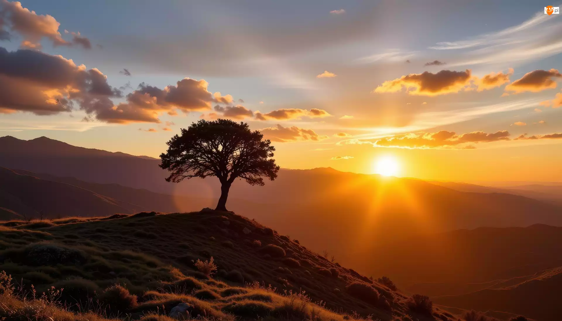 Góry, Drzewo, Wzgórze, Zachód słońca