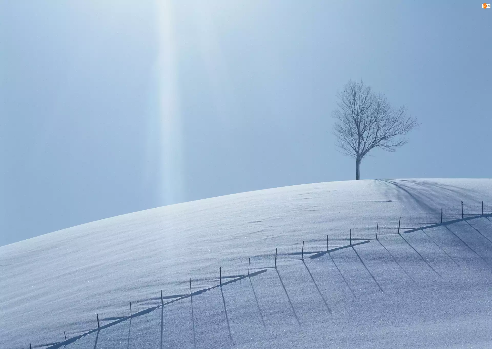 Drzewo, Promienie, Śnieg, Słońce, Zaspy, Płot