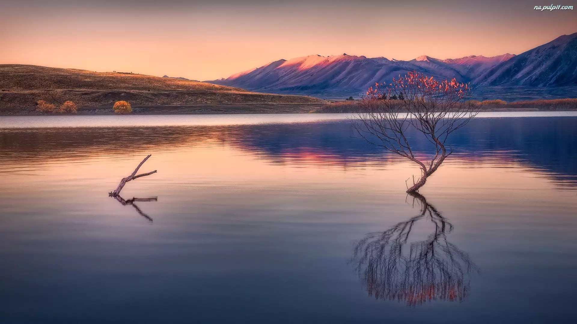 Wanaka, Drzewo, Jezioro, Nowa Zelandia, Góry