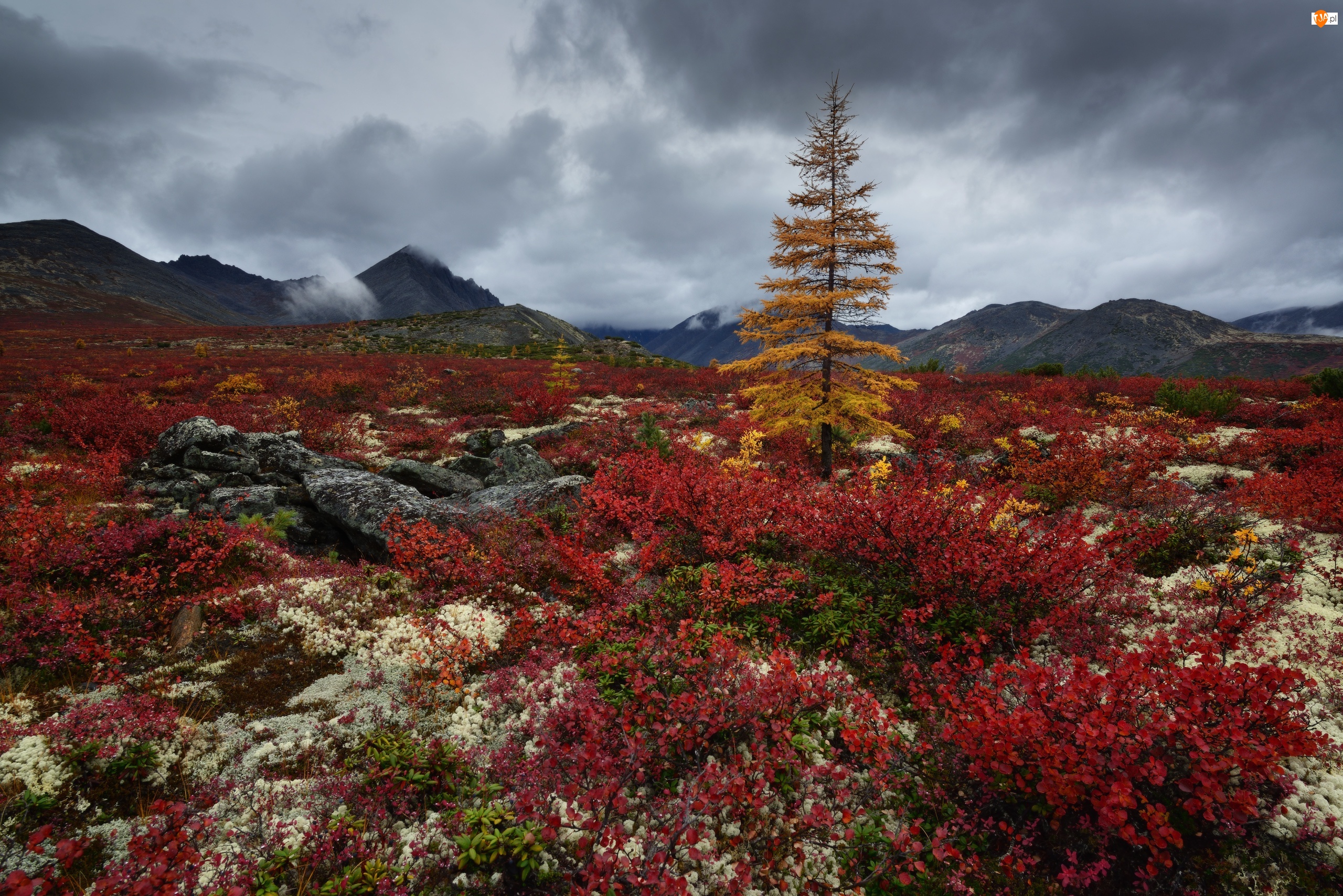 Kołyma, Drzewa, Kamienie, Obwód magadański, Góry Kołymskie, Jesień, Rosja, Roślinność