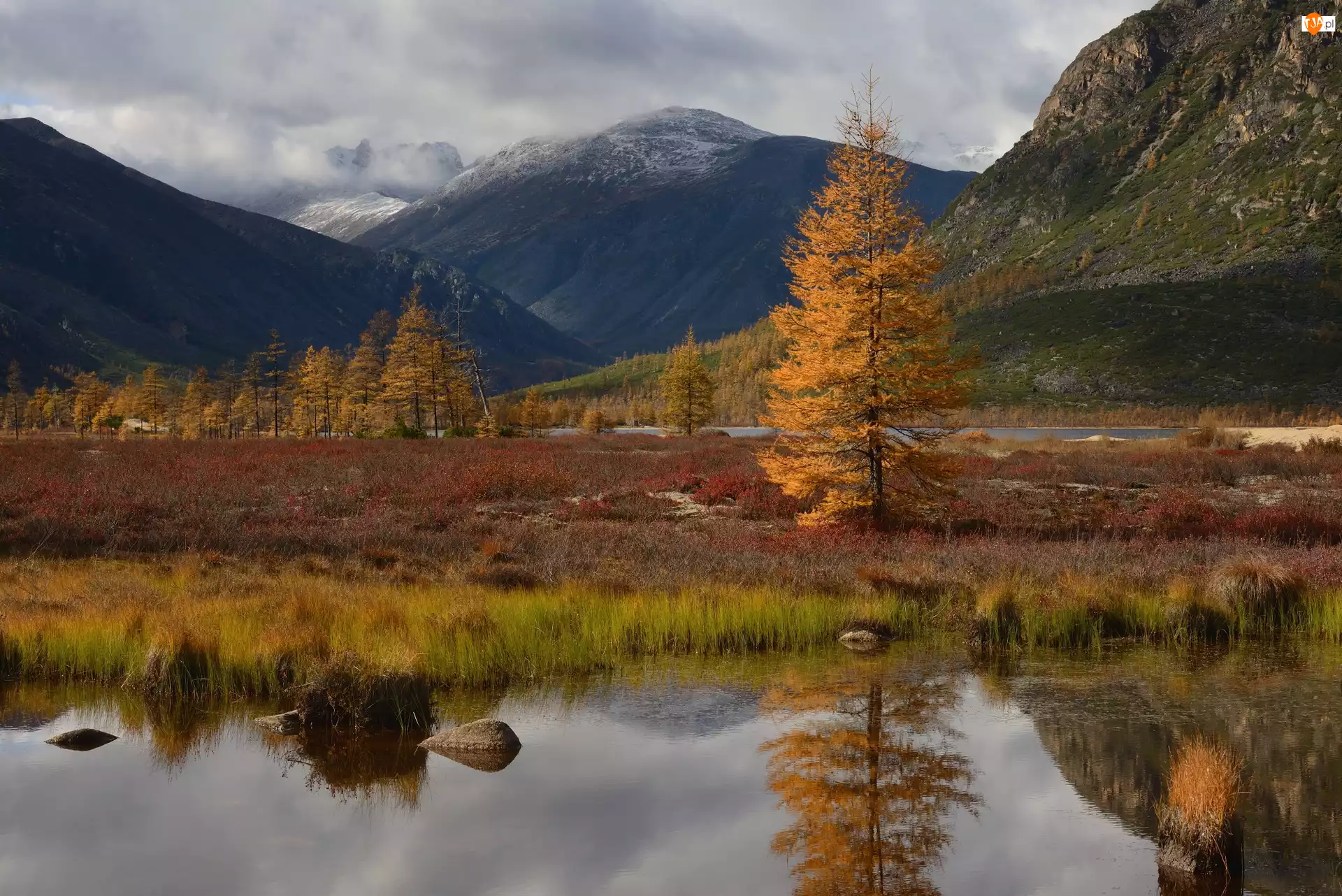 Rosja, Jesień, Kołyma, Odbicie, Jezioro Jack London, Góry Kołymskie, Trawa, Drzewa, Mgła, Obwód magadański