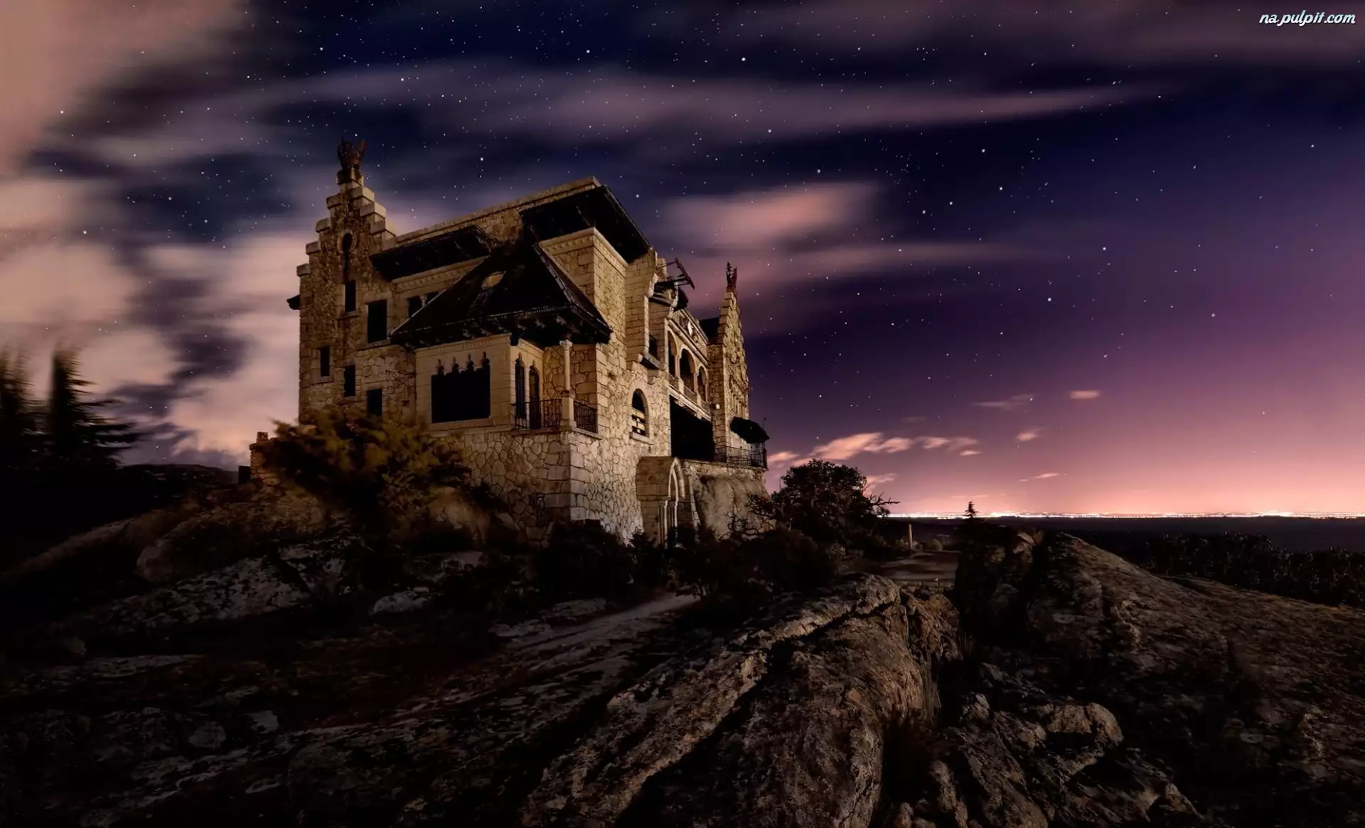 Duży dom na skałach na tle ciemnego nieba
