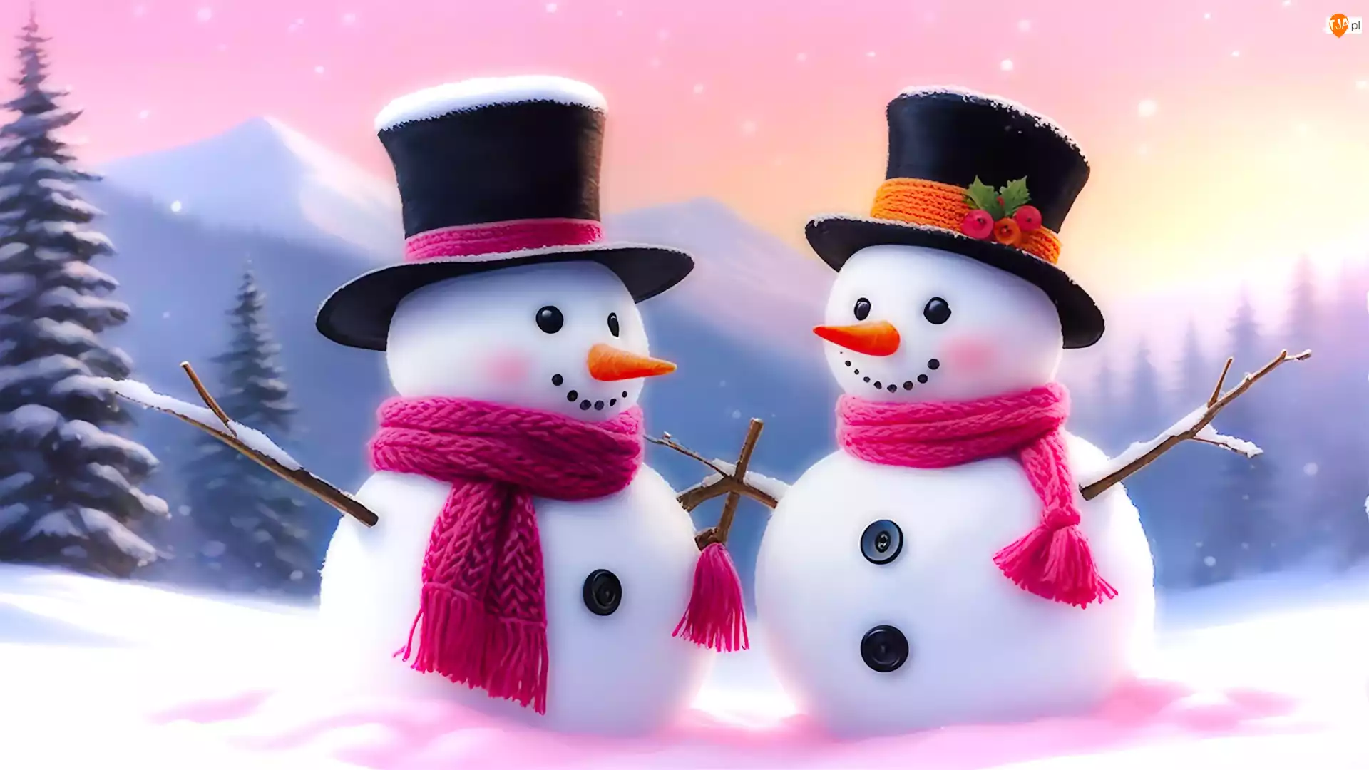 Dwa bałwankiw czarnych kapeluszach i różowych s
