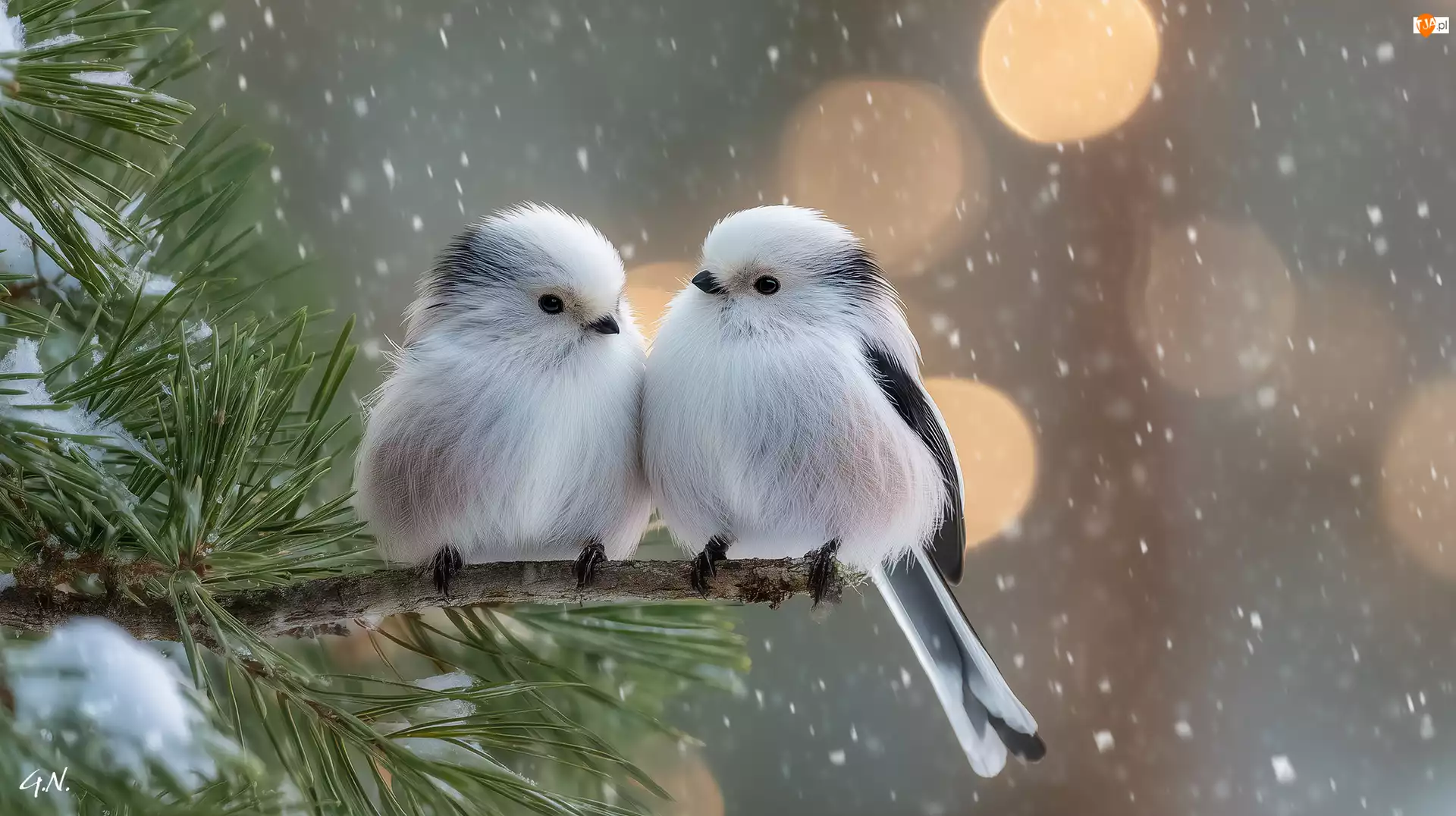 Gałązka, Dwa, Raniuszki, Zima, Białe, Ośnieżona, Grafika AI, Ptaki