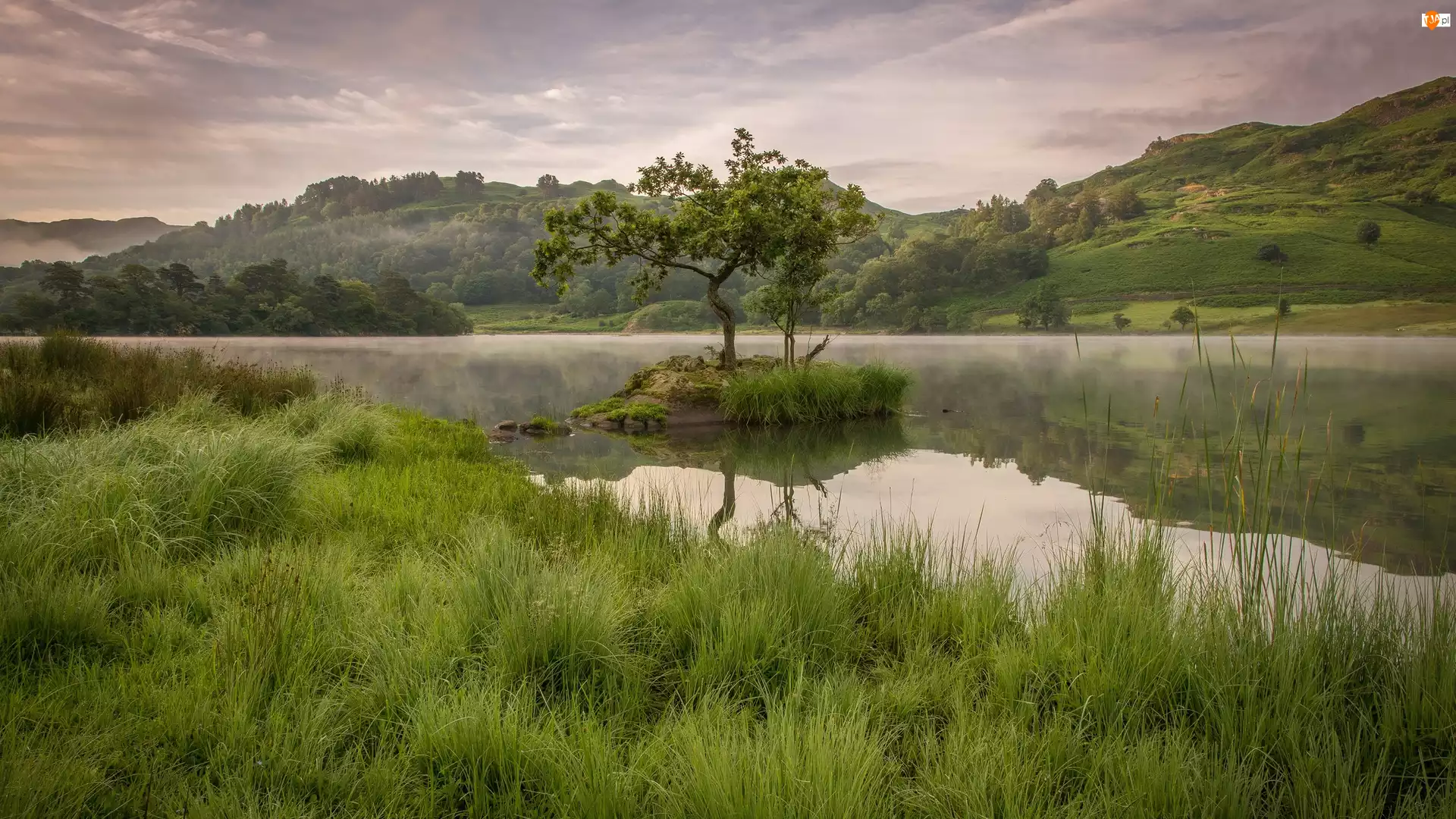 Trawa, Jezioro, Wzgórza, Chmury, Drzewa, Mgła