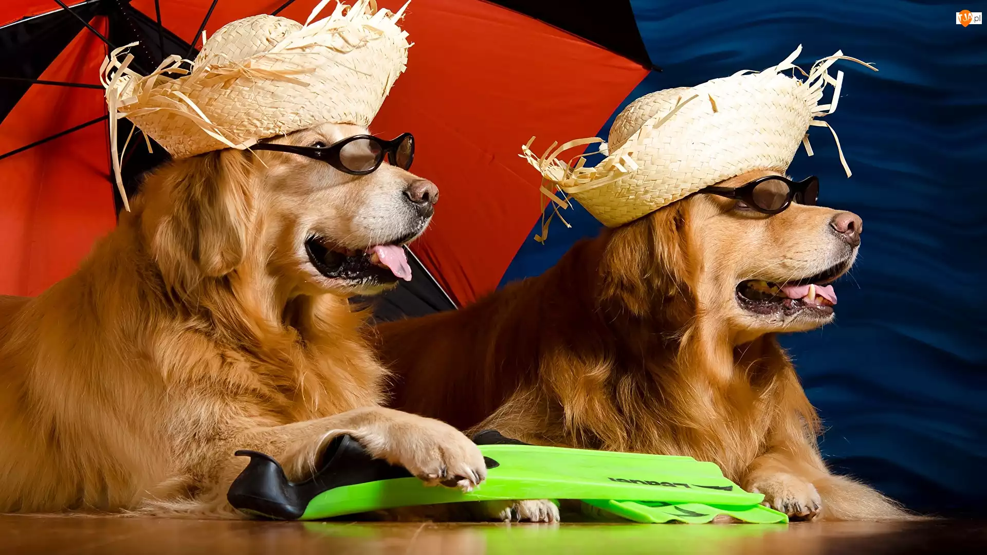 Psy, Dwa, Parasol, Okulary, Golden retriever, Kapelusze