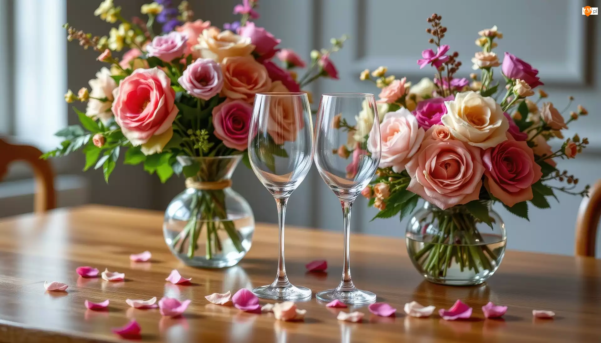 Dwa, Grafika AI, Bukiety, Róże, Kieliszki