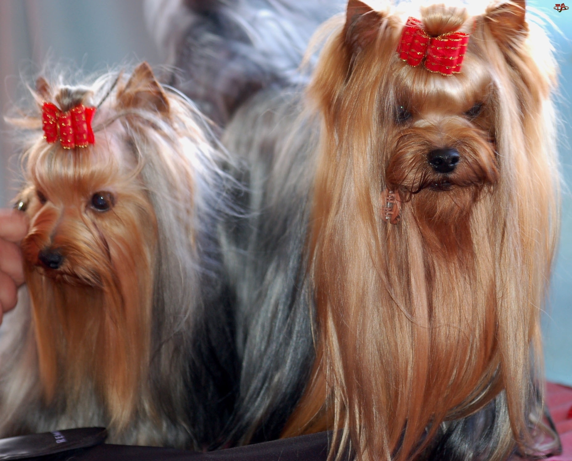 dwa, kokardki, Yorkshire Terriery, czerwone