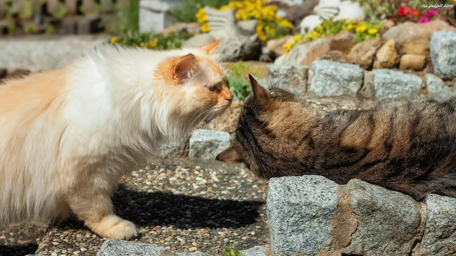 Dwa koty obok kamieni w ogrodzie